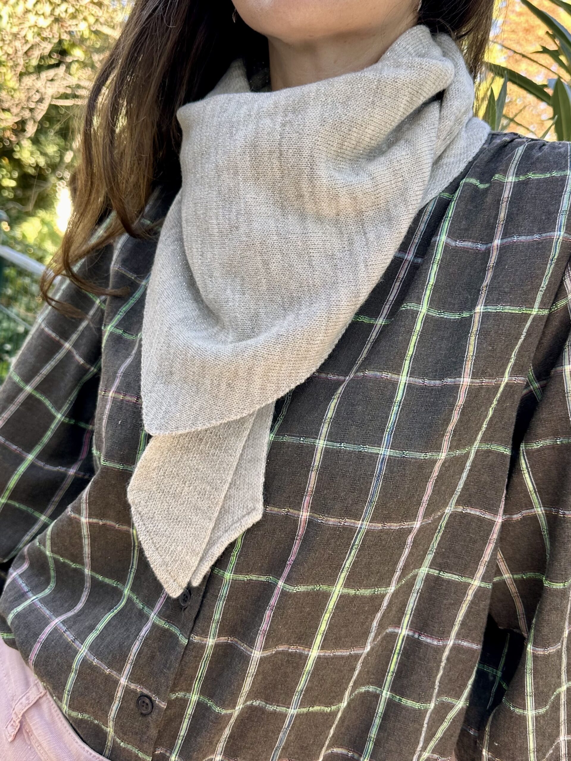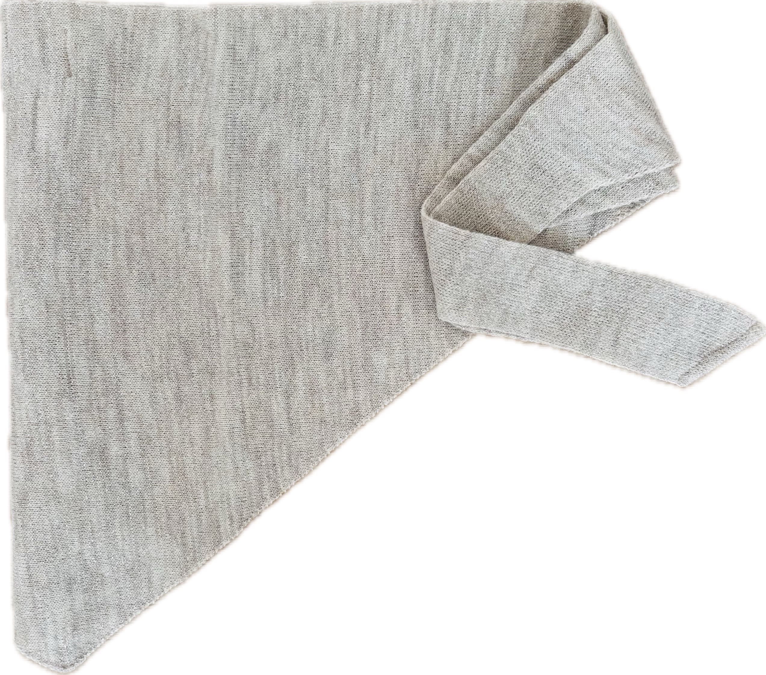 Práctica bandana de punto confeccionado en mezcla de lana virgen 30% y acrílico 70%, con hilo de lúrex. Tono arena jaspeado.
