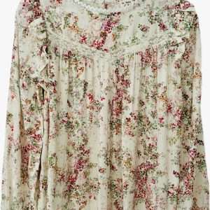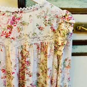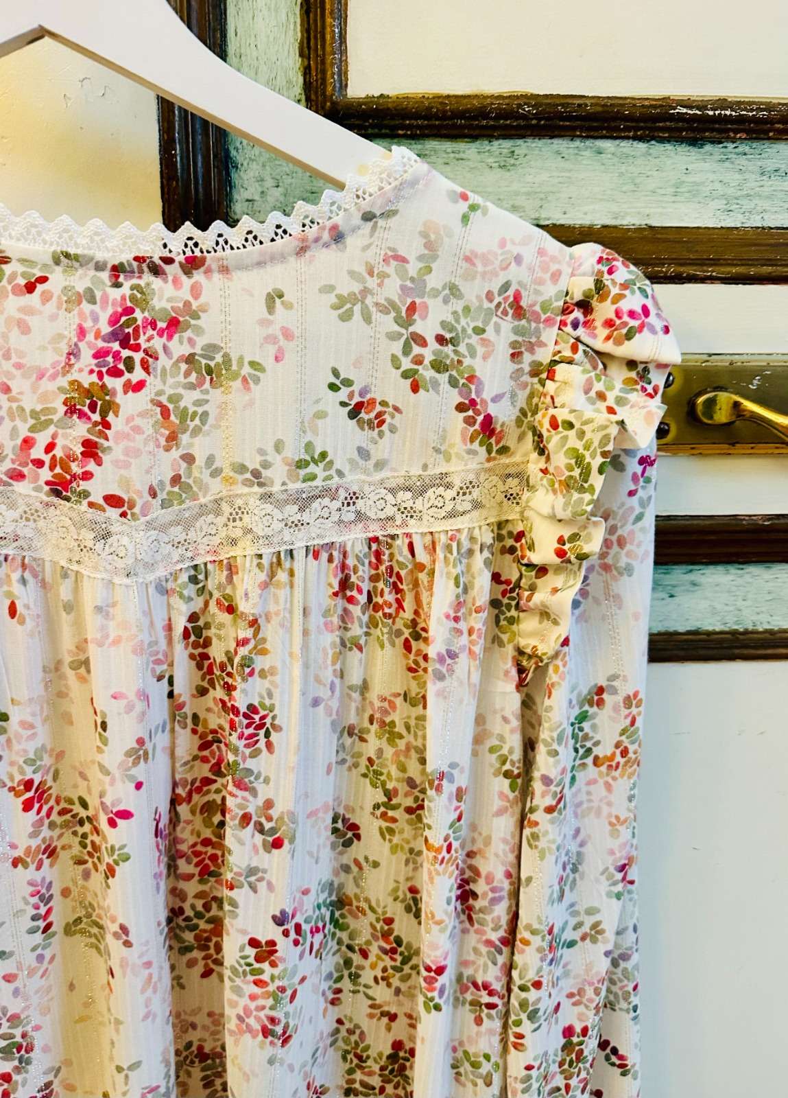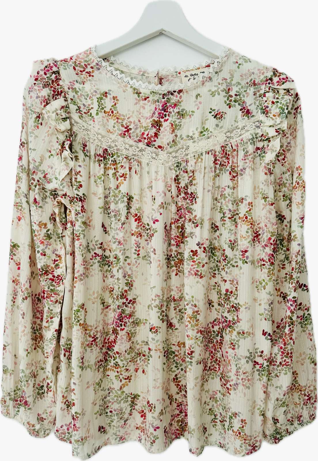 Blusa ligera y fluida confeccionado en viscosa 100% con hilo de lurex, con una franja delantera en encaje de Valenciennes y pequeño volate en el hombro. Manga larga con puño elástico. Cuello rematado con un fino encaje. Apertura con botón en la espalda.Tela con certificado OEKO-TEX Standard 100.