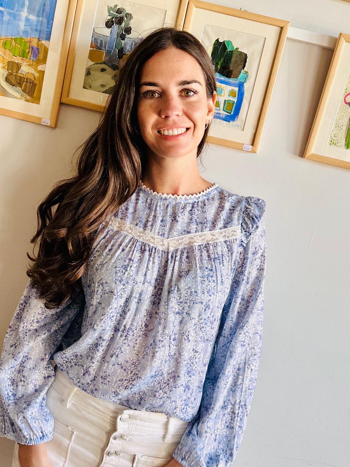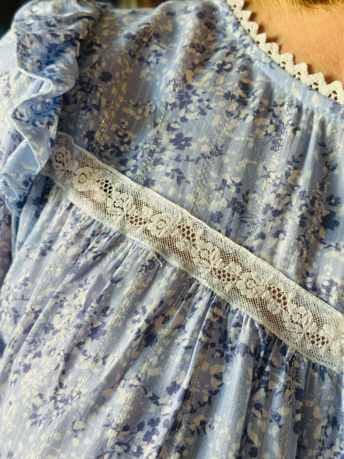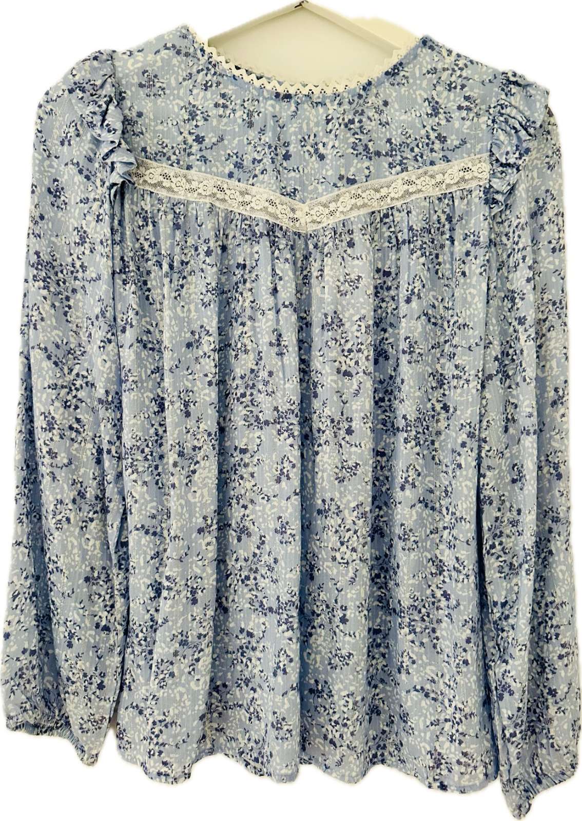 Blusa ligera y fluida confeccionado en viscosa 100% con hilo de lurex, con una franja delantera en encaje de Valenciennes y pequeño volate en el hombro. Manga larga con puño elástico. Cuello rematado con un fino encaje. Apertura con botón en la espalda. Tela con certificado OEKO-TEX Standard 100.