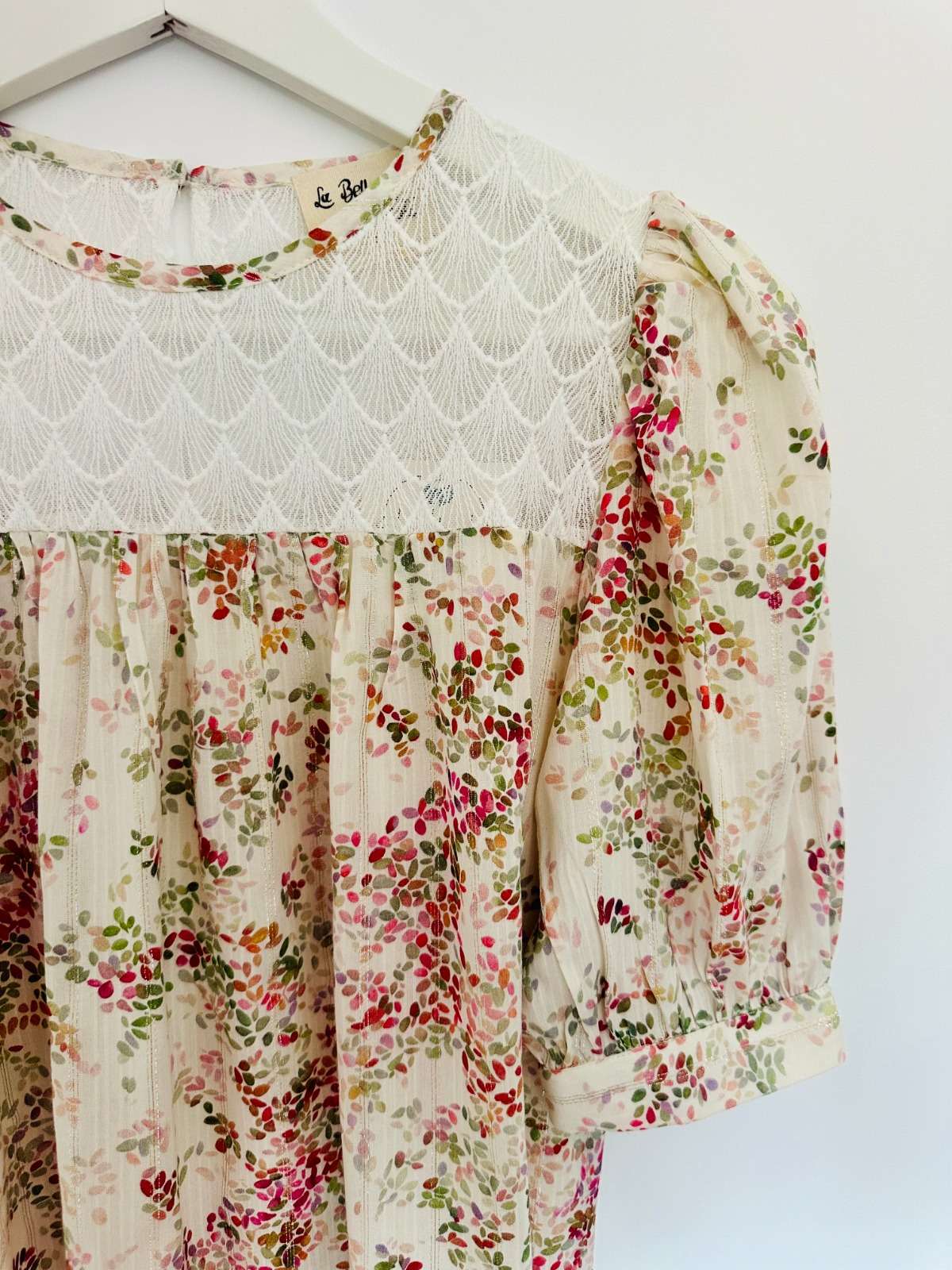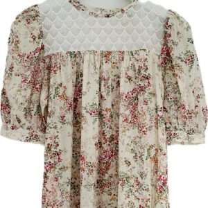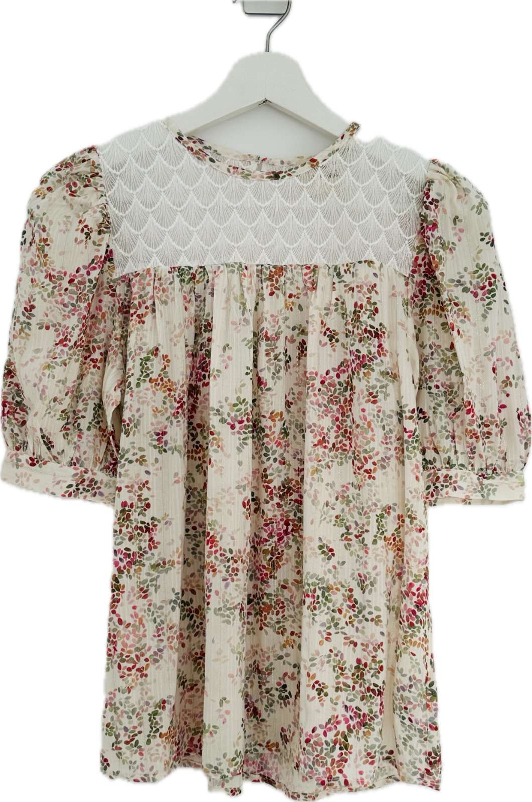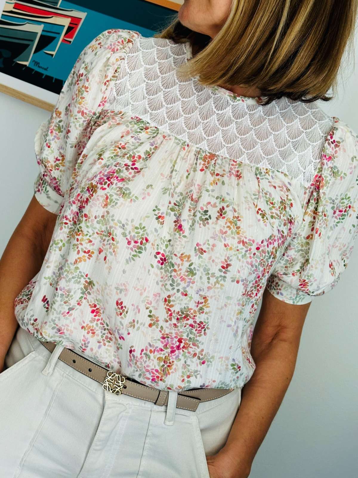 Blusa ligera y fluida con manga corta ligeramente abullonada, confeccionada en viscosa 100% estampada con hilo de lúrex y canesú de encaje. Cuello redondo rematado con un fino remate del tejido floral. Apertura con botón en la espalda. Tela floral con certificado OEKO-TEX Standard 100.