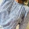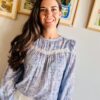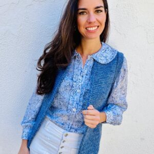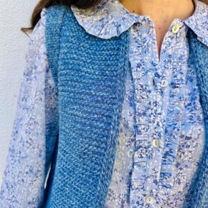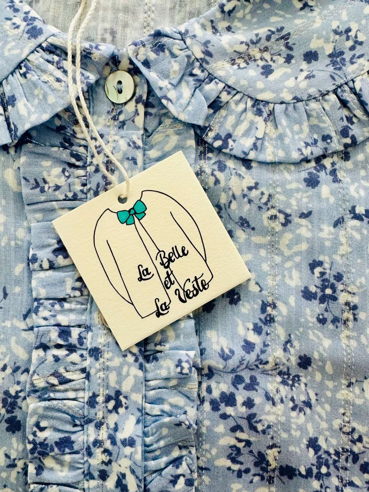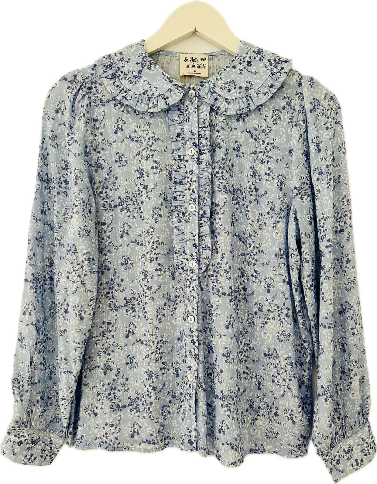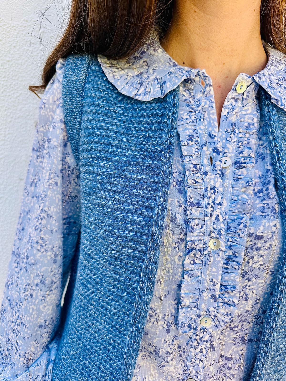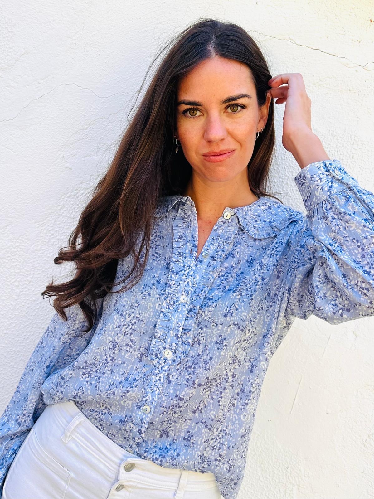 Blusa ligera y fluida confeccionado en viscosa 100% con hilo de lurex, con apertura frontal rematada con un fino volante en la parte superior. Cuello tipo Peter Pan rematado con volante. Puño con botón. Tela con certificado OEKO-TEX Standard 100.