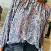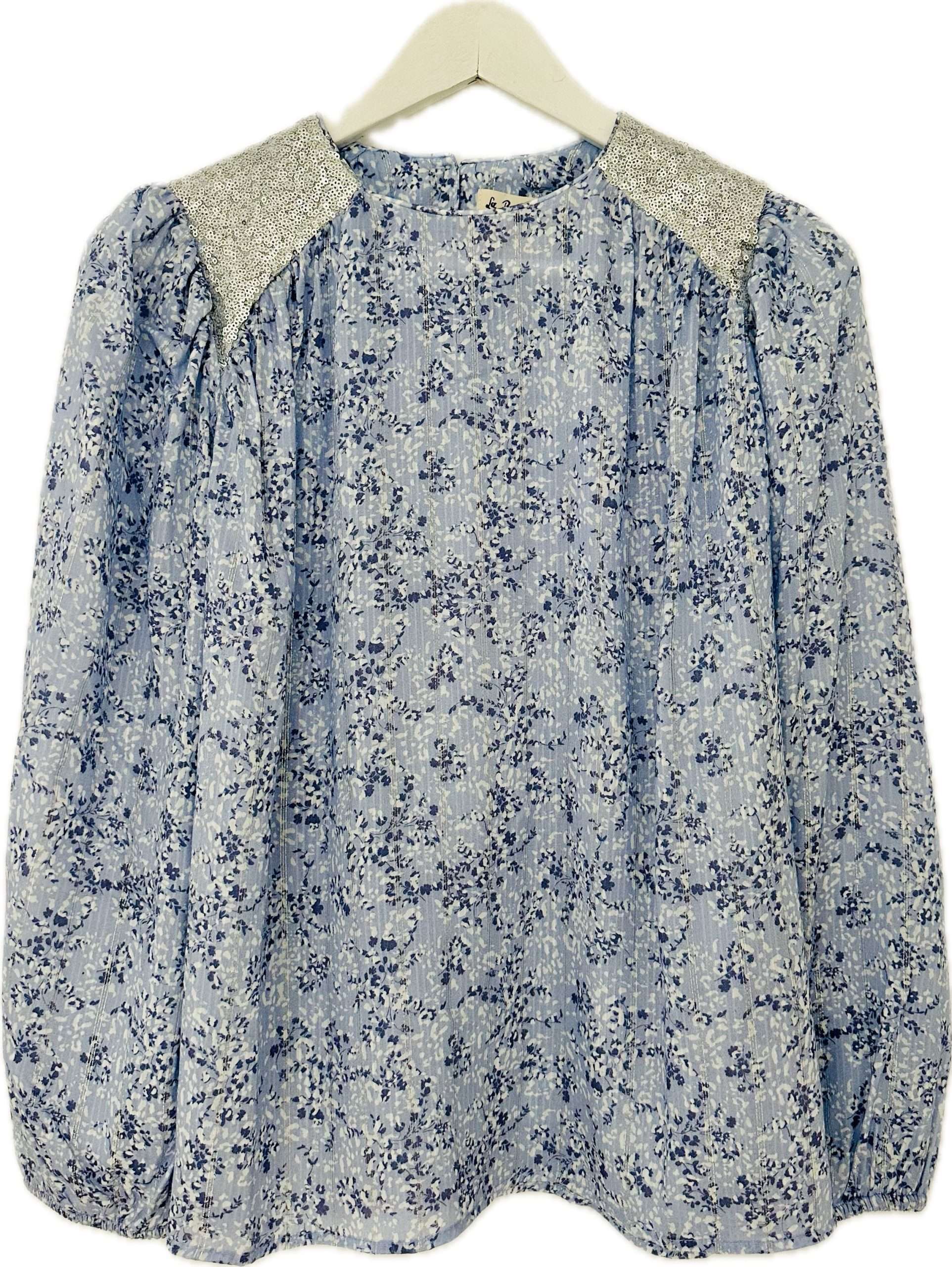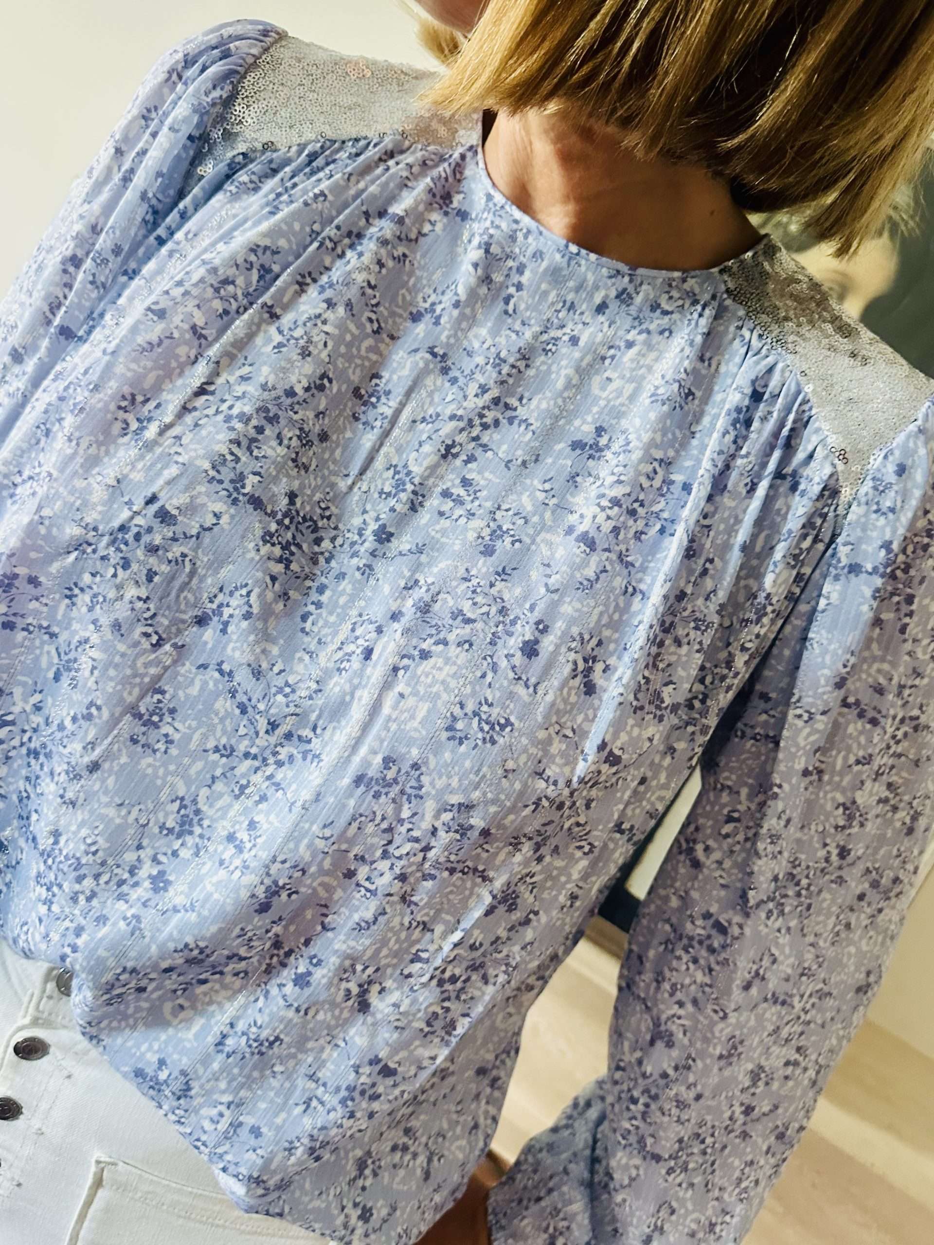 Blusa de manga larga de puño elastico con ligeros frunces en los hombros. Cuello redondo con botón en parte trasera. Confeccionada en Viscosa 100% con hilo de lurex, y tejido de lentejuelas en las hombreras, lo que la hace perfecta tanto para looks de día como de noche. Tela con certificado OEKO-TEX