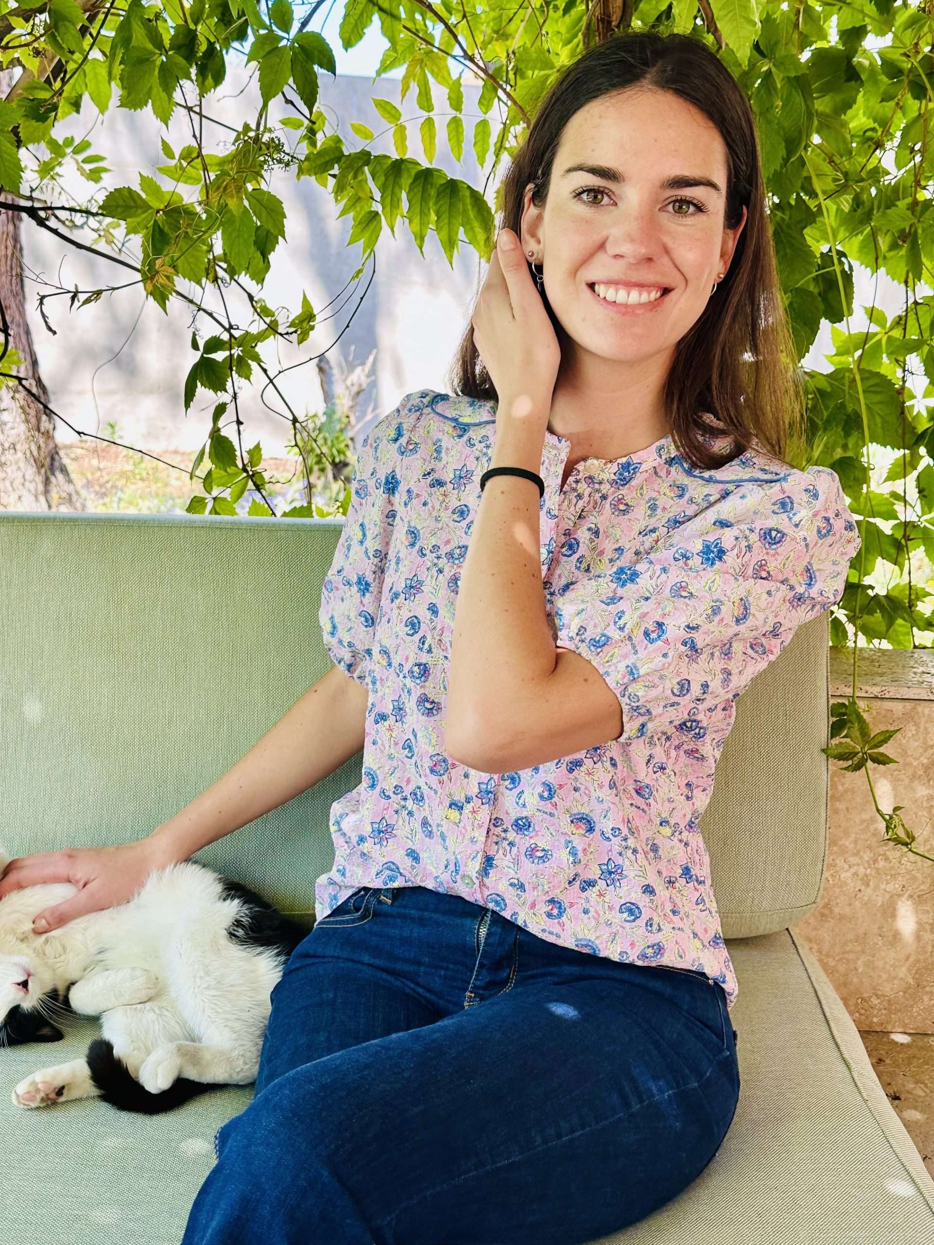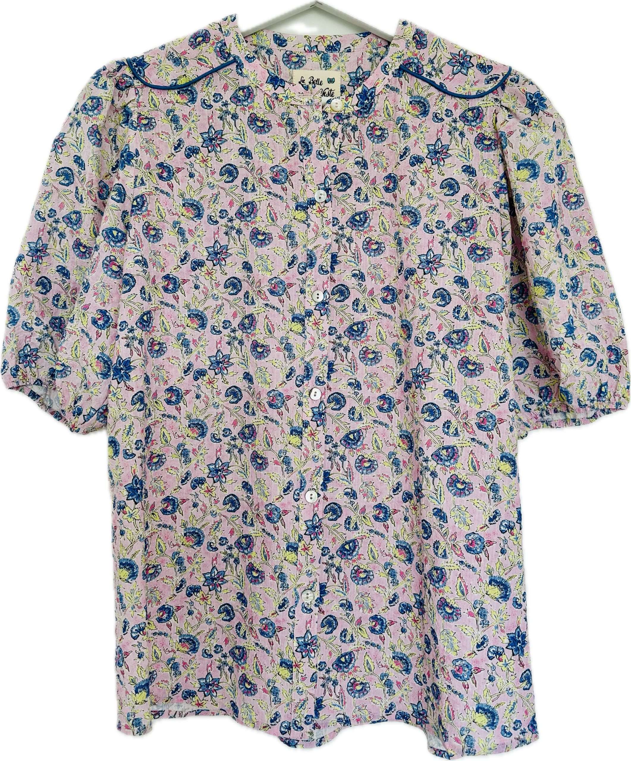 Camisa de corte recto, confeccionada en algodón 100%. Cuello redondo, abotonada y con vivo en el canesú en los hombros y parte trasera. Manga corta ligeramente abullorada.