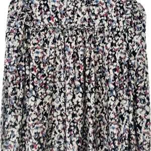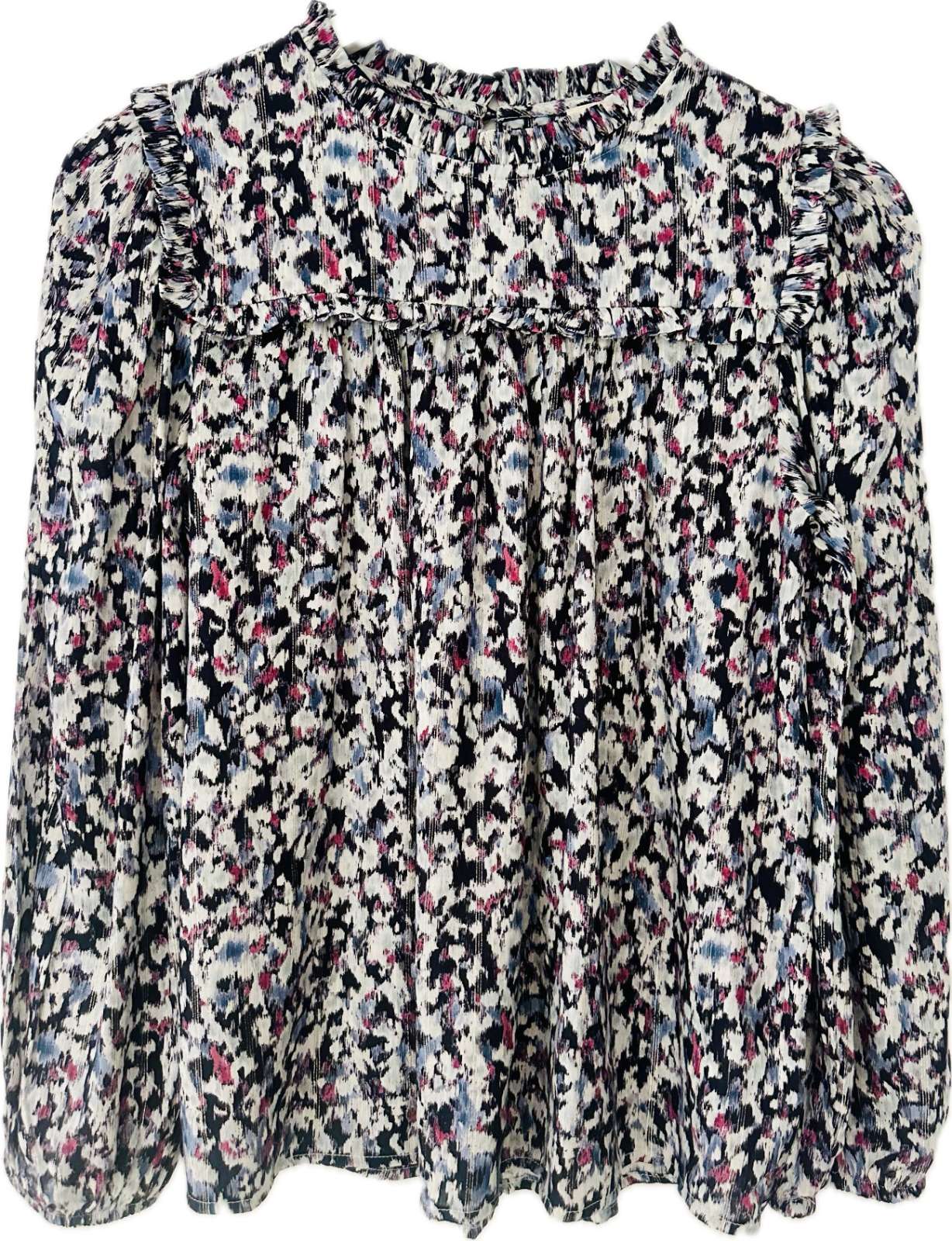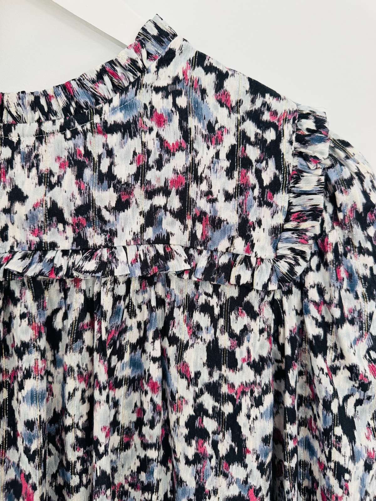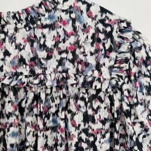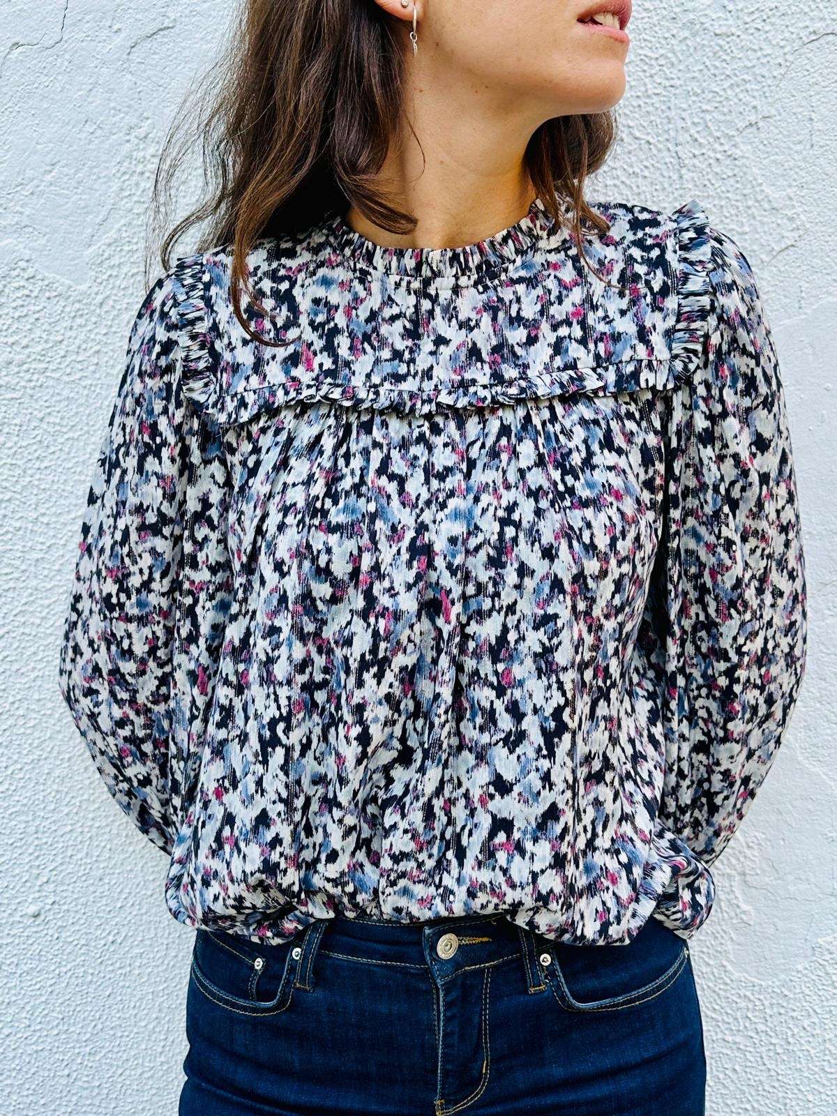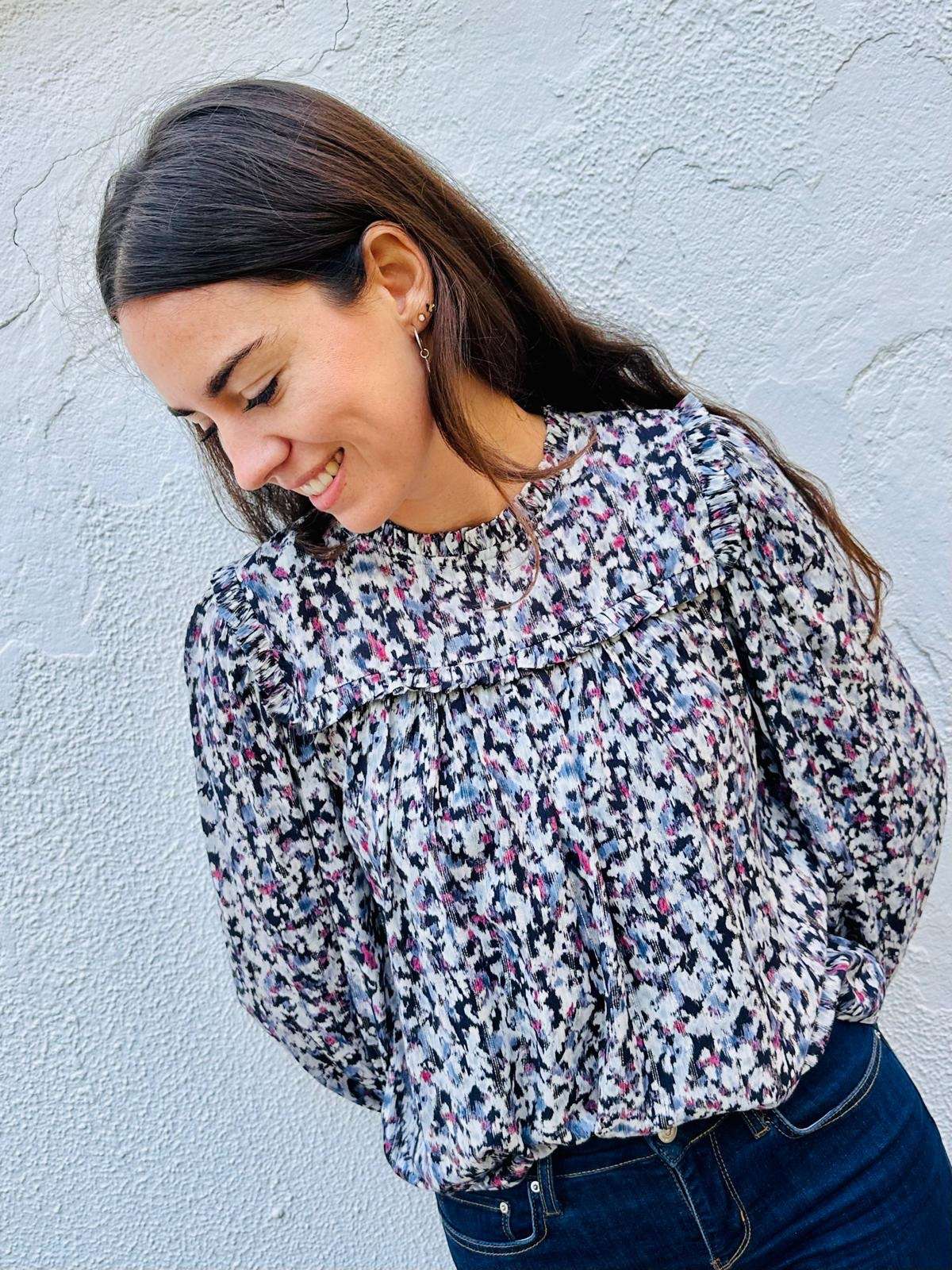 Blusa ligera y fluida confeccionada en viscosa 100% estampada con hilo de lúrex. Pequeño volante en el cuello y a lo largo de toda la pechera. Manga larga con puño elástico. Apertura con botón en la espalda. Tela con certificado OEKO-TEX Standard 100.