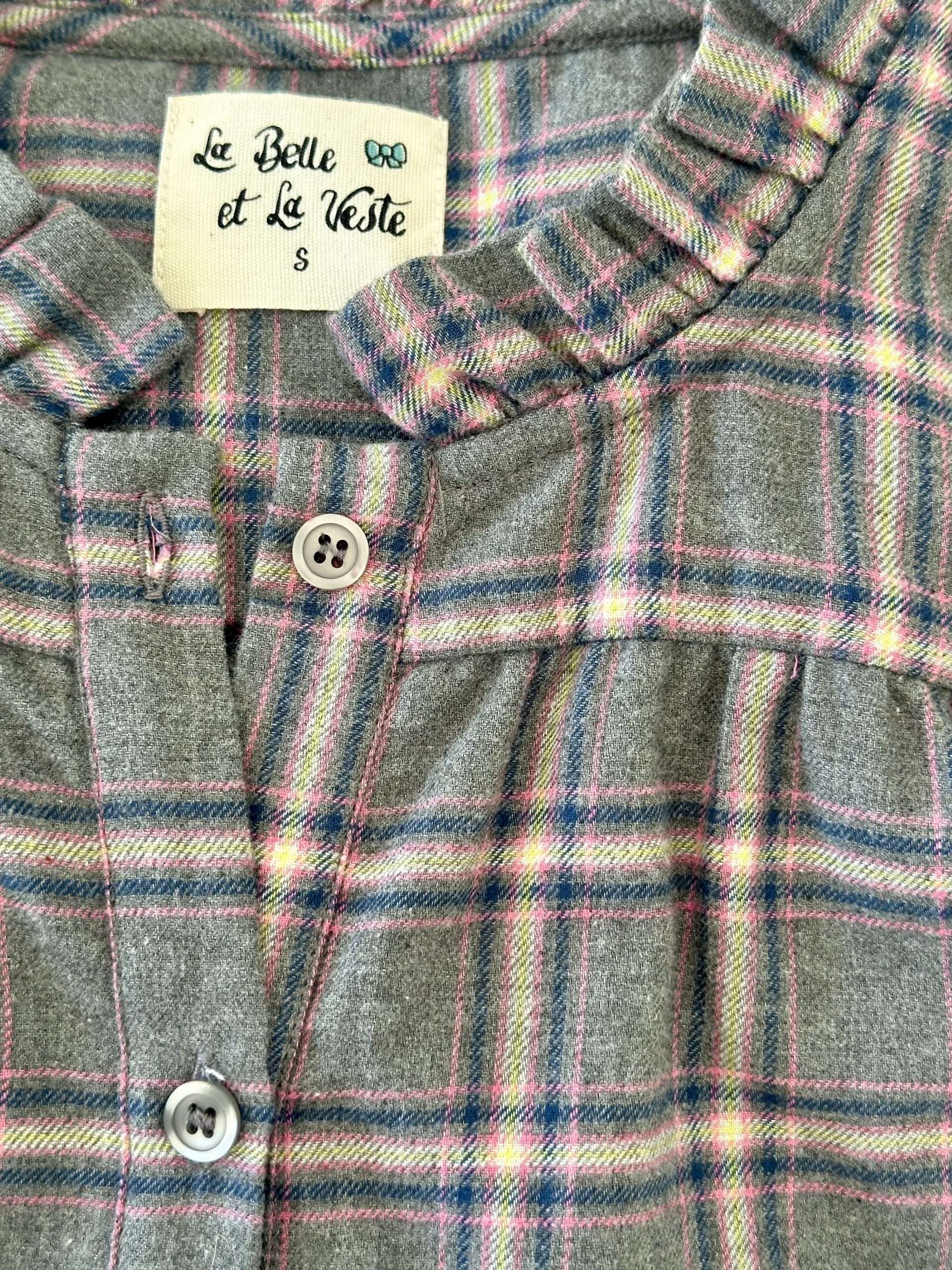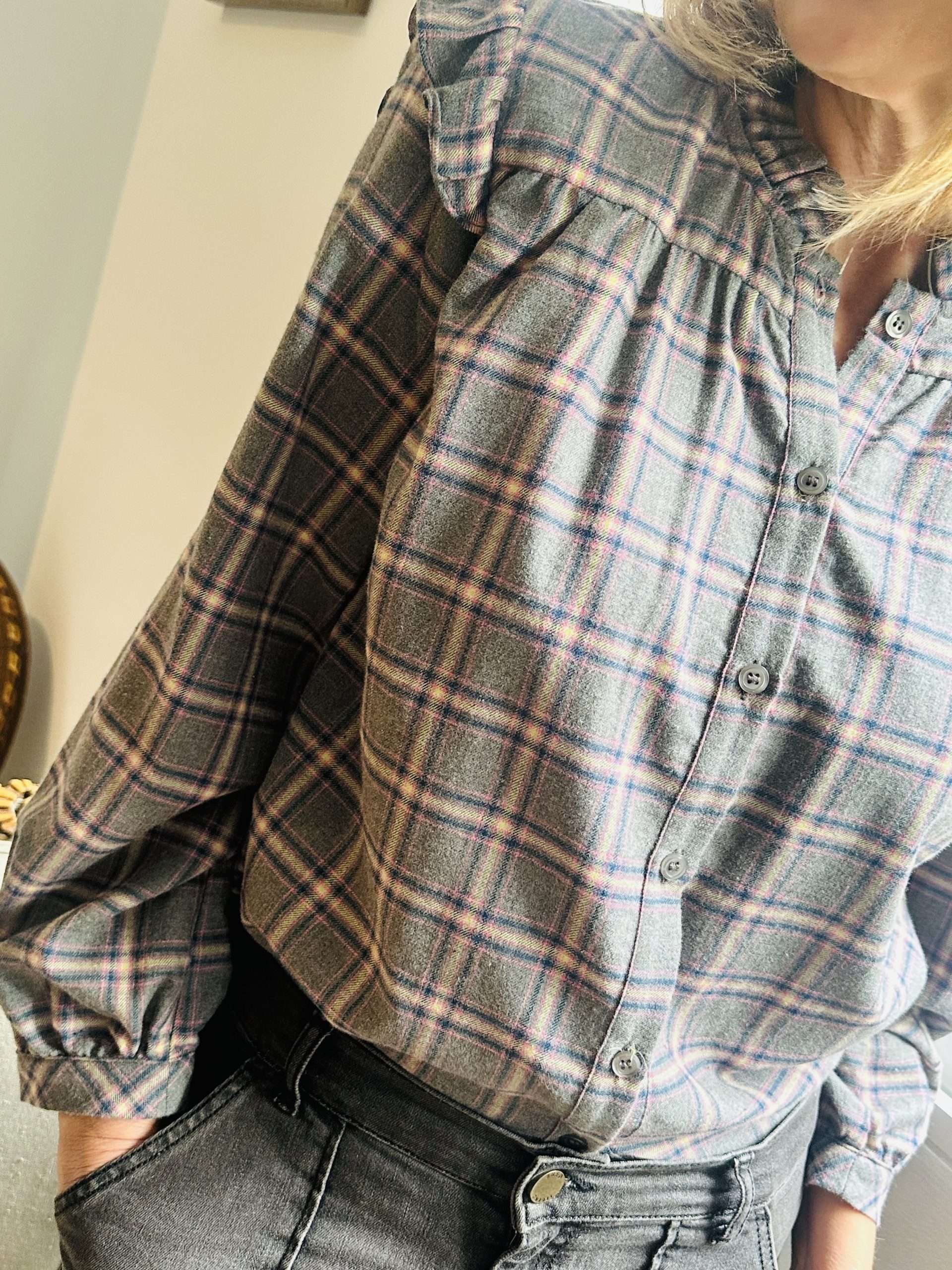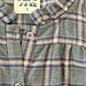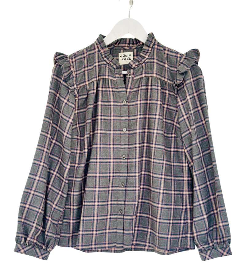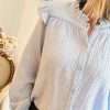 Camisa de manga larga confeccionada en algodón 100% orgánico. Con delicados volantes en cuello y hombros, canesú en la parte frontal de la camisa ligeramente fruncido e hilera de botones.