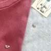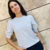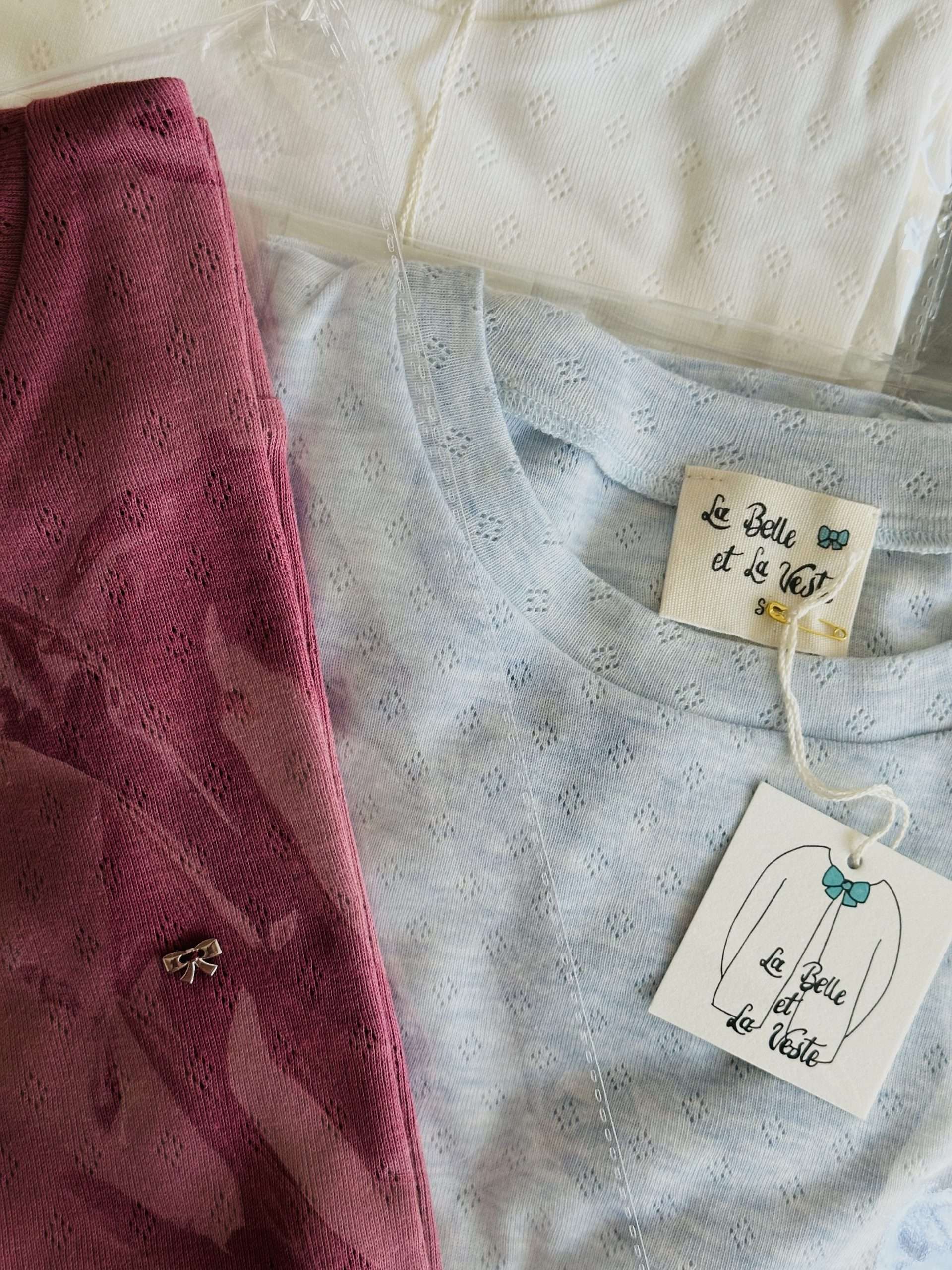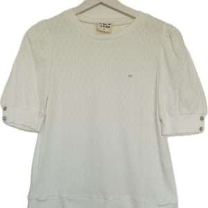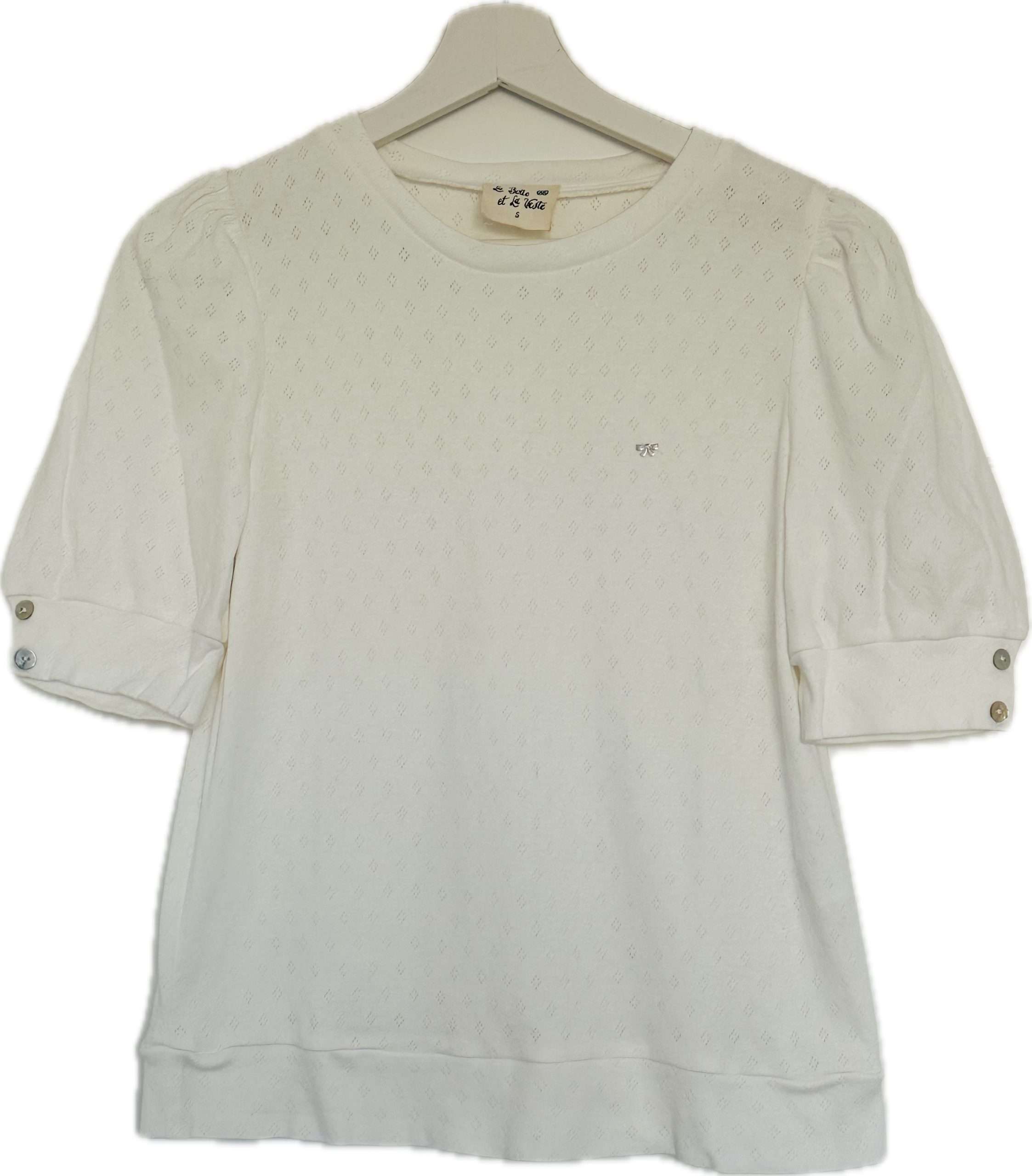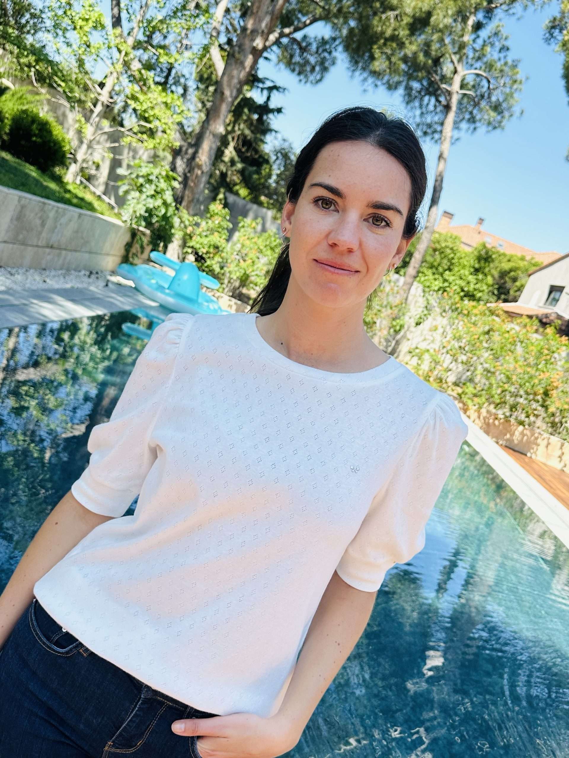 Camiseta confeccionada en punto de algodón 100% con calado con forma de diamante. Cuello redondo, manga corta con puño ancho rematado con dos botones de nacar en cada lado y hombros abullonados. Pequeño lazo plateado cosido. Tela con certificado OEKO-TEX Standard 100