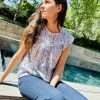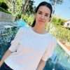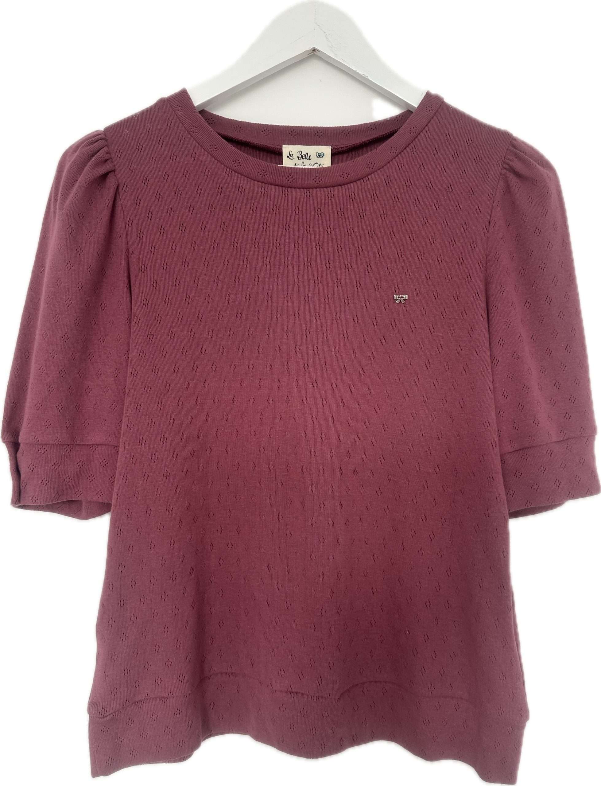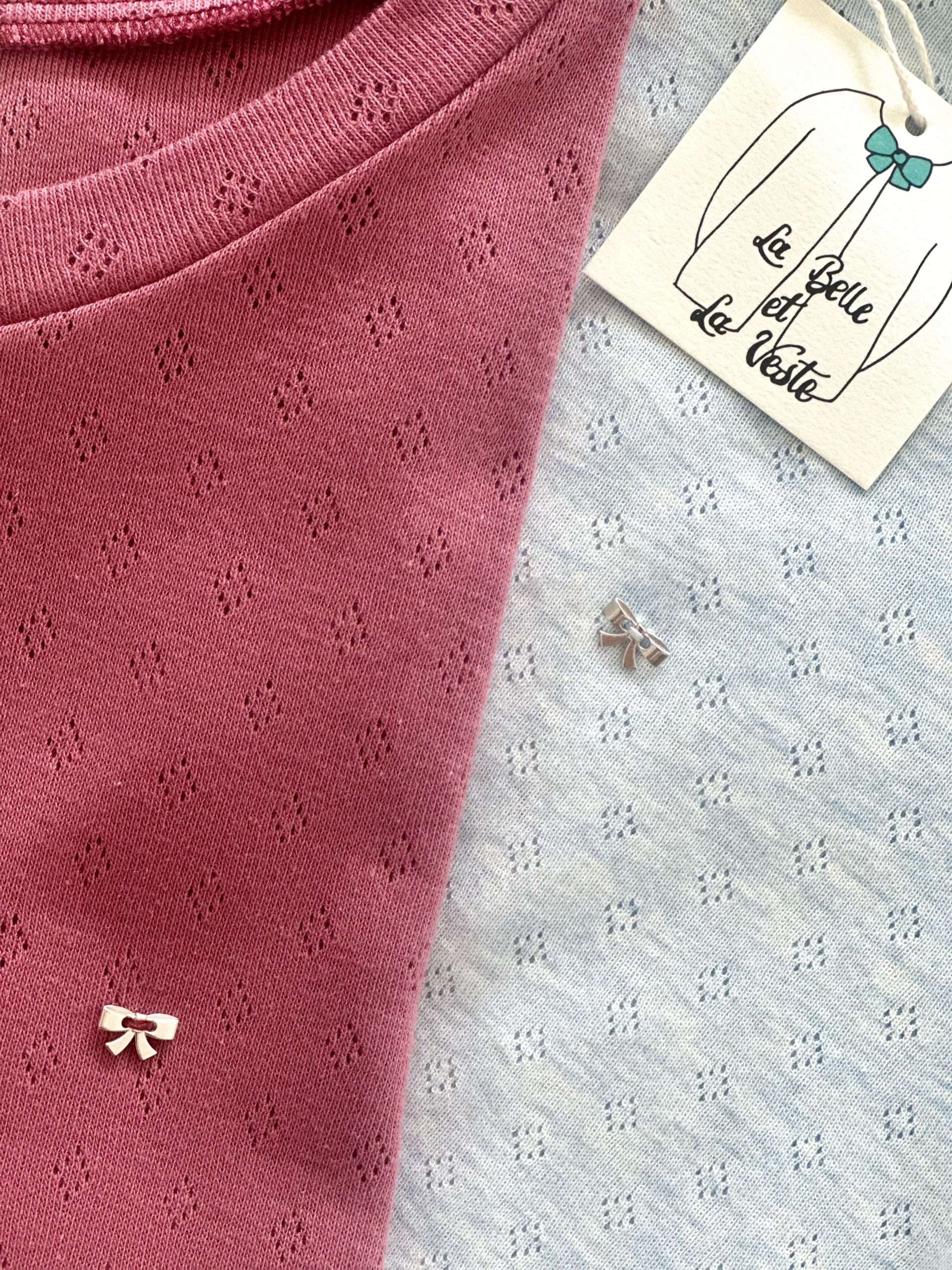 Camiseta confeccionada en punto de algodón 100% con calado con forma de diamante. Cuello redondo, manga corta con puño ancho rematado con dos botones de nacar en cada lado y hombros abullonados. Pequeño lazo plateado cosido. Tela con certificado OEKO-TEX Standard 100
