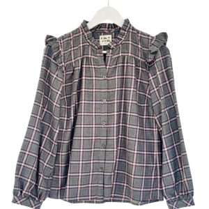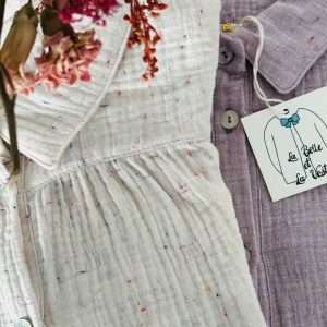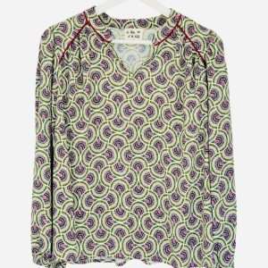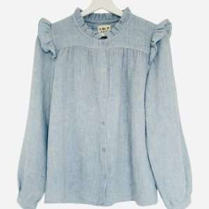 Camisa Damas. Camisa confeccionada en algodón. Cuello redondo, con botonadura lateral. Manga larga con puño abotonado ligeramente ancho. Tanto el cuello como la botonadura están ribeteadas con un delicado encaje de guipur. Tela con certificado GOTS.