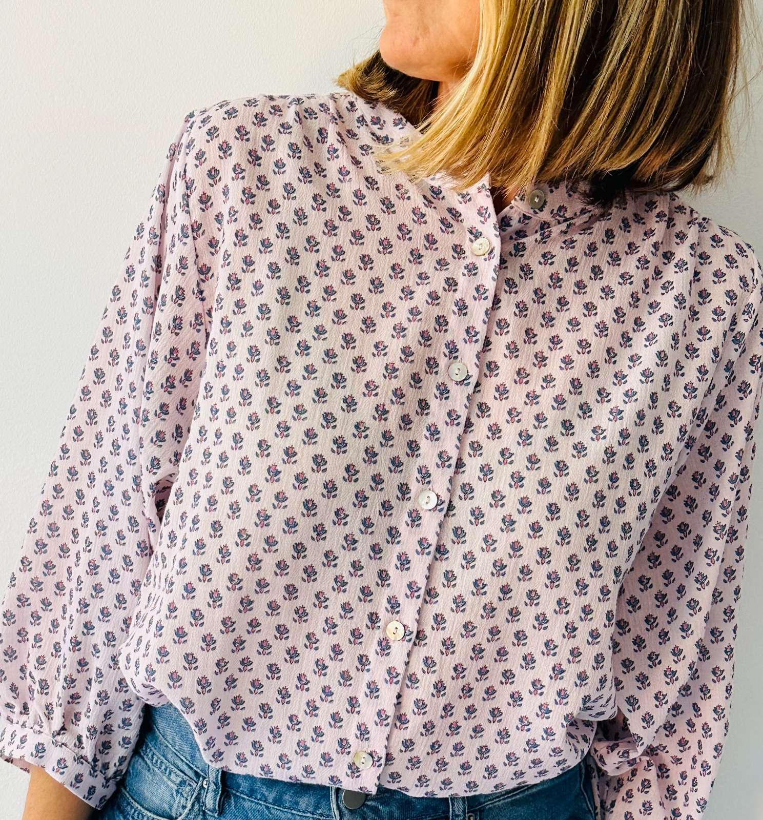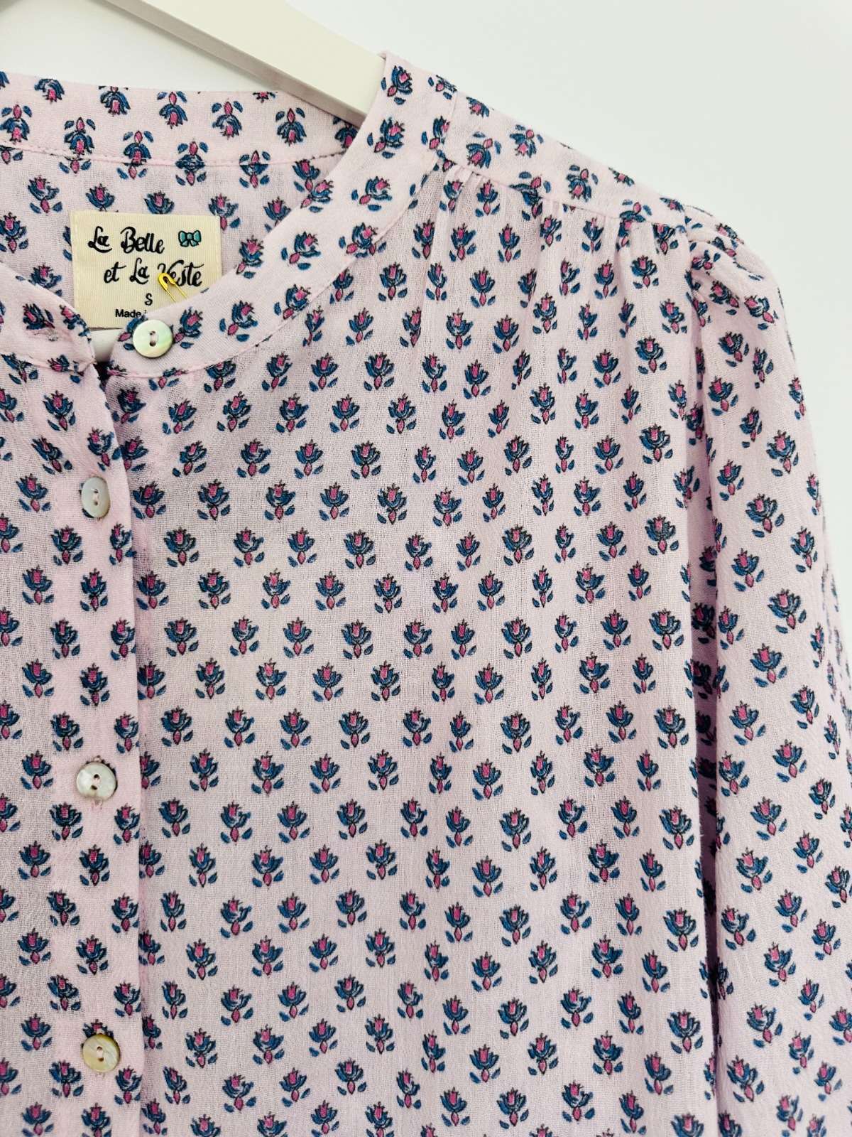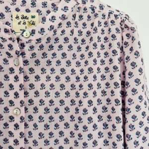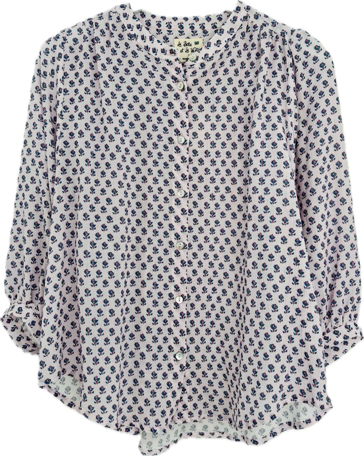 Camisa fluida confeccionada en algodón 100%. Cuello redondo, totalmente abotonada en su parte delantera. Manga globo tres cuartos. Tejido con certificado OEKO-Tex Standard 100
