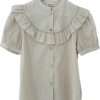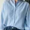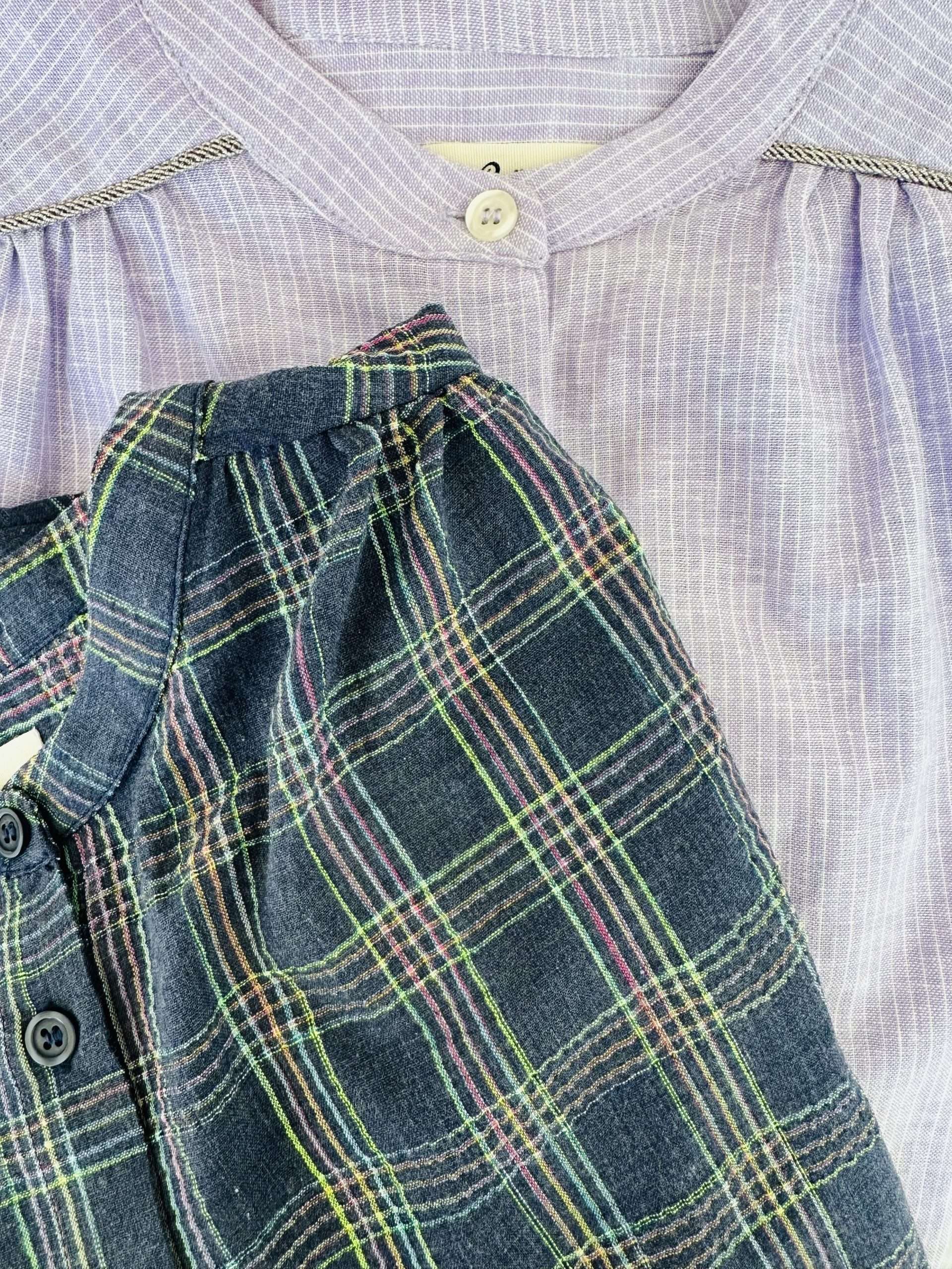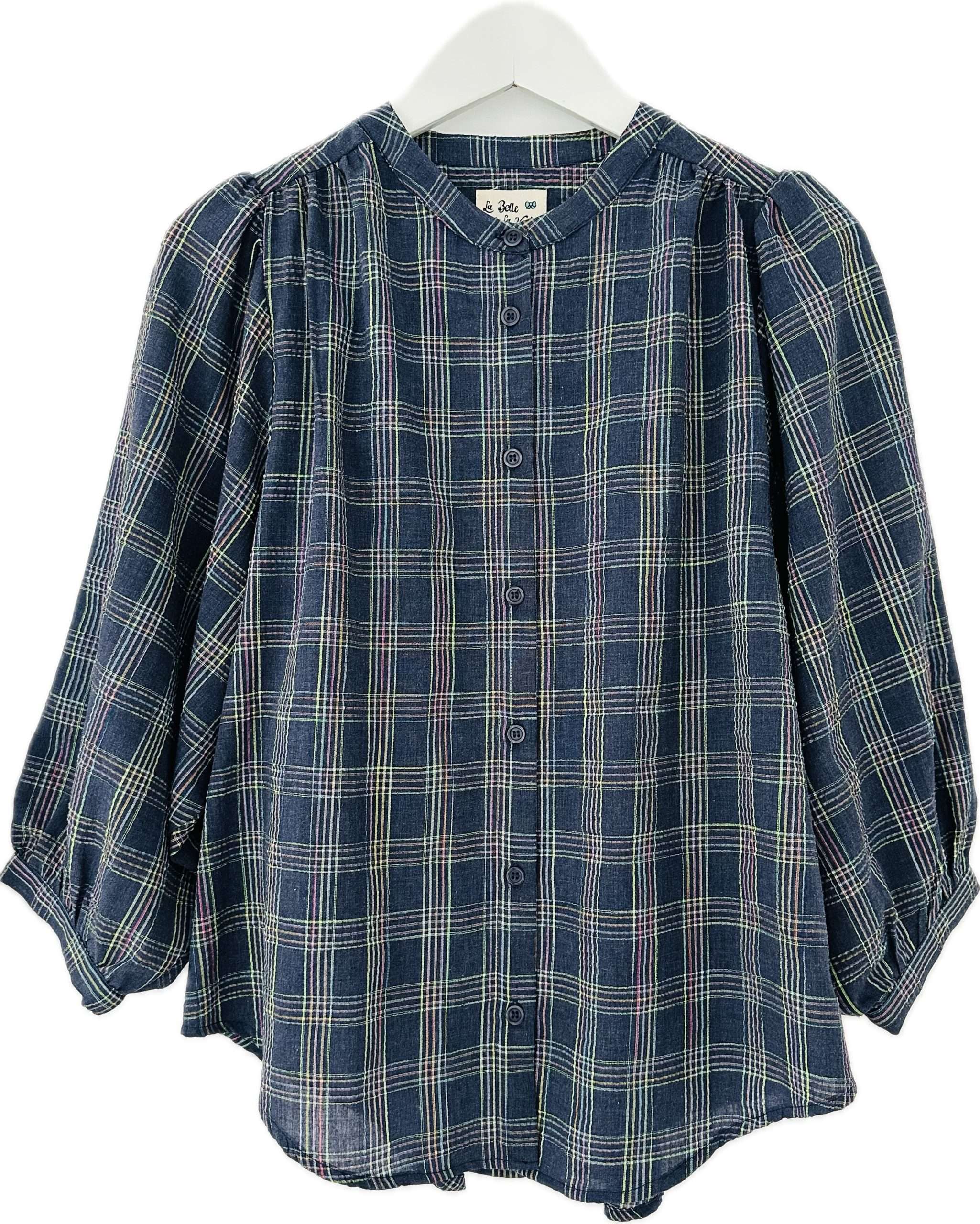 Camisa fluida confeccionada en un voile de cuadros 70% algodón y 30% poliéster. Cuello redondo, totalmente abotonada en su parte delantera. Manga globo tres cuartos. Corte amplio