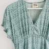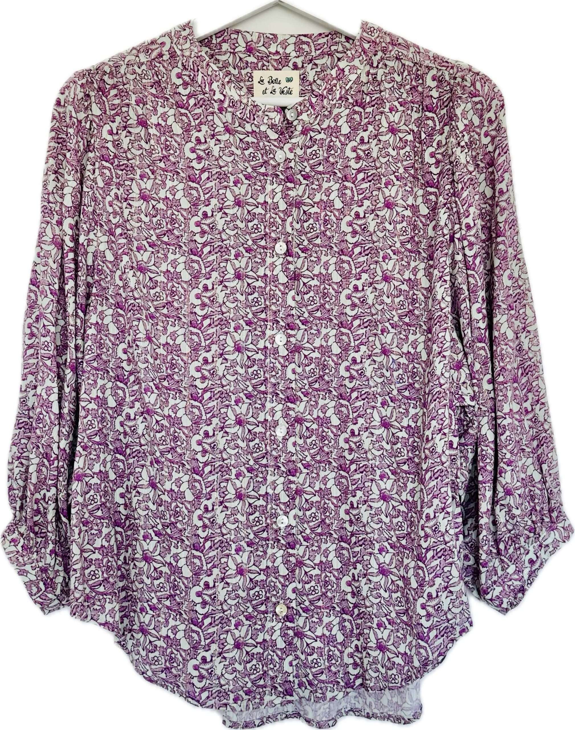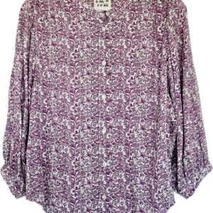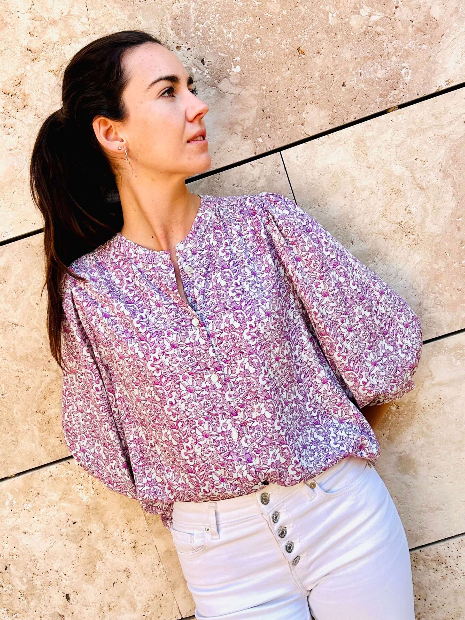 Camisa fluida confeccionada en viscosa 100% con hilo de lurex. Cuello redondo, totalmente abotonada en su parte delantera. Manga globo tres cuartos. Tejido con certificado OEKO-Tex Standard 100