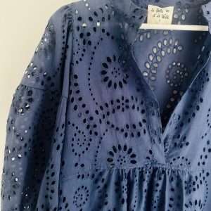 Camisa fluida confeccionada en viscosa 100% con hilo de lurex. Cuello redondo, totalmente abotonada en su parte delantera. Manga globo tres cuartos. Tejido con certificado OEKO-Tex Standard 100
