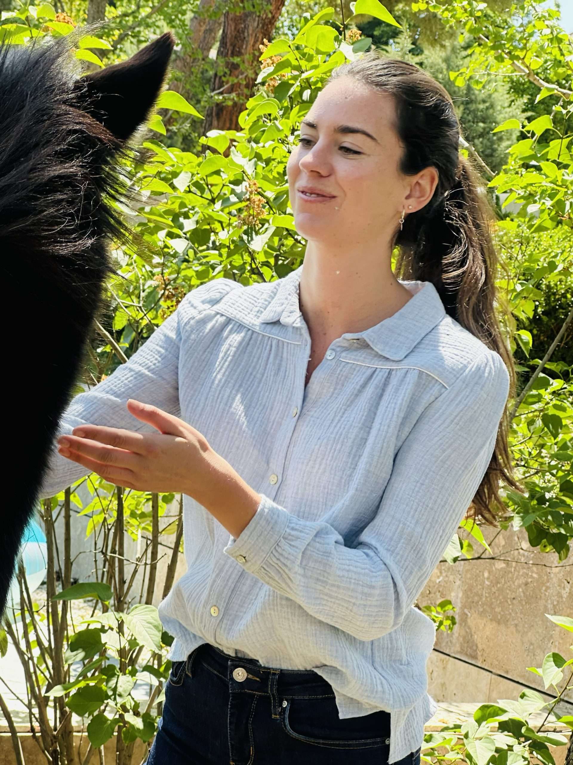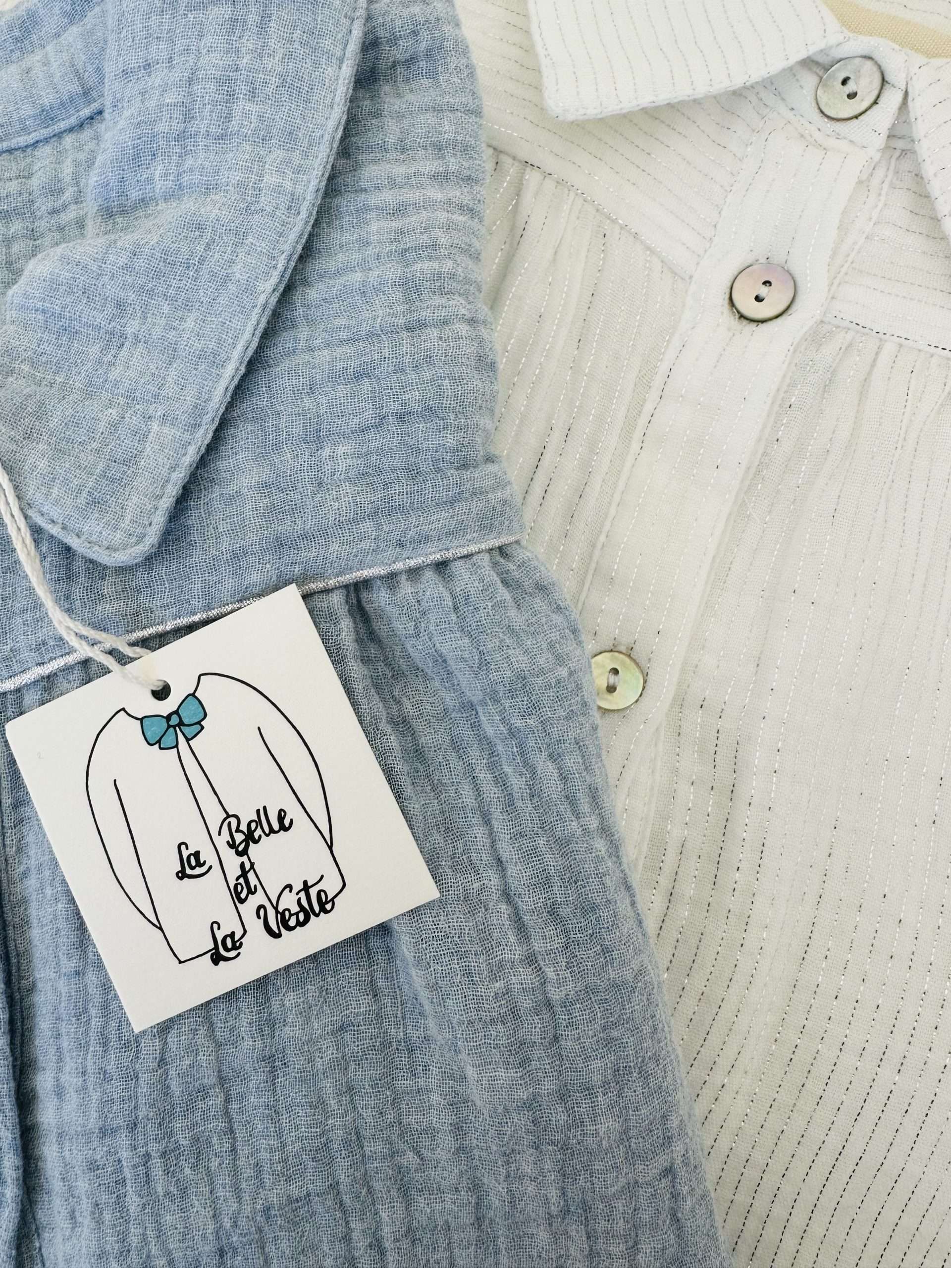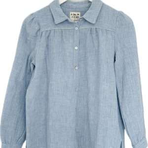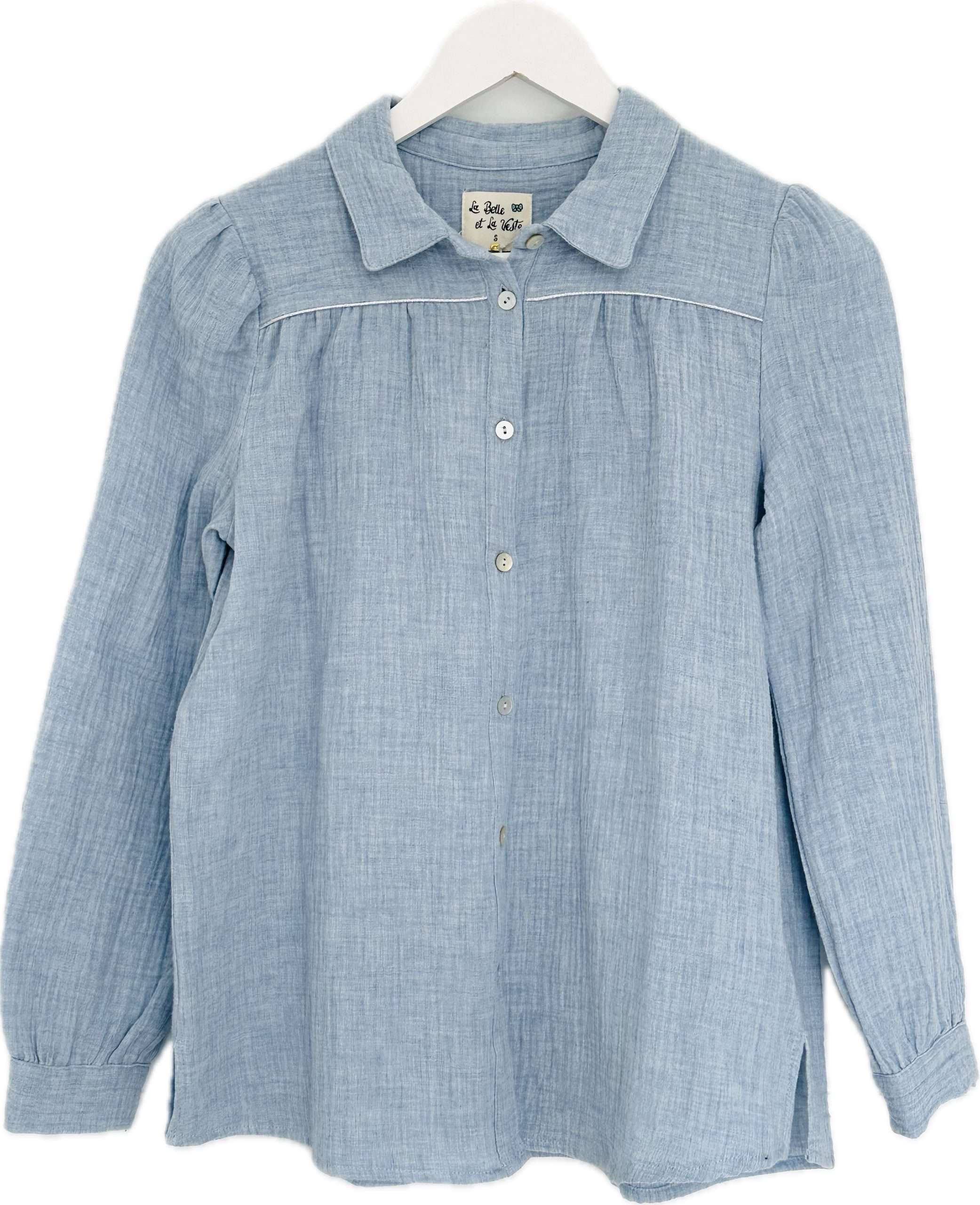 Camisa confeccionada en una bambula 100% de algodón orgánico con vivo plateado en el canesú. Cuello camisero y hombros ligeramente abullonados. Puños con cierre de botón. Tejido con certificado OEKO-TEX Standard 100