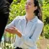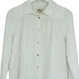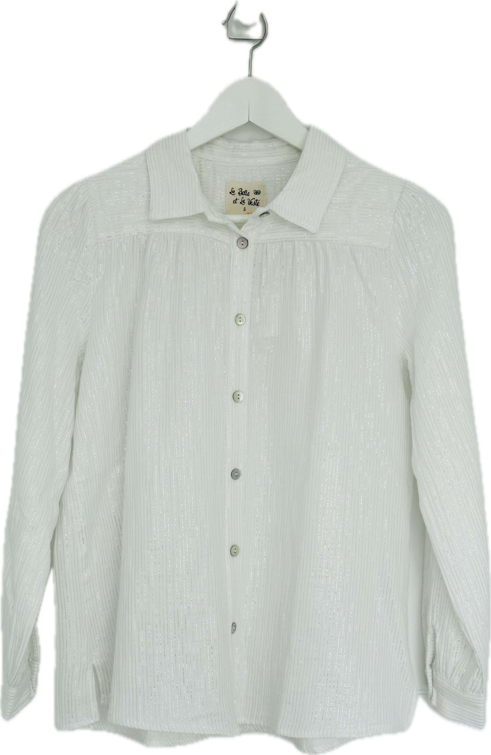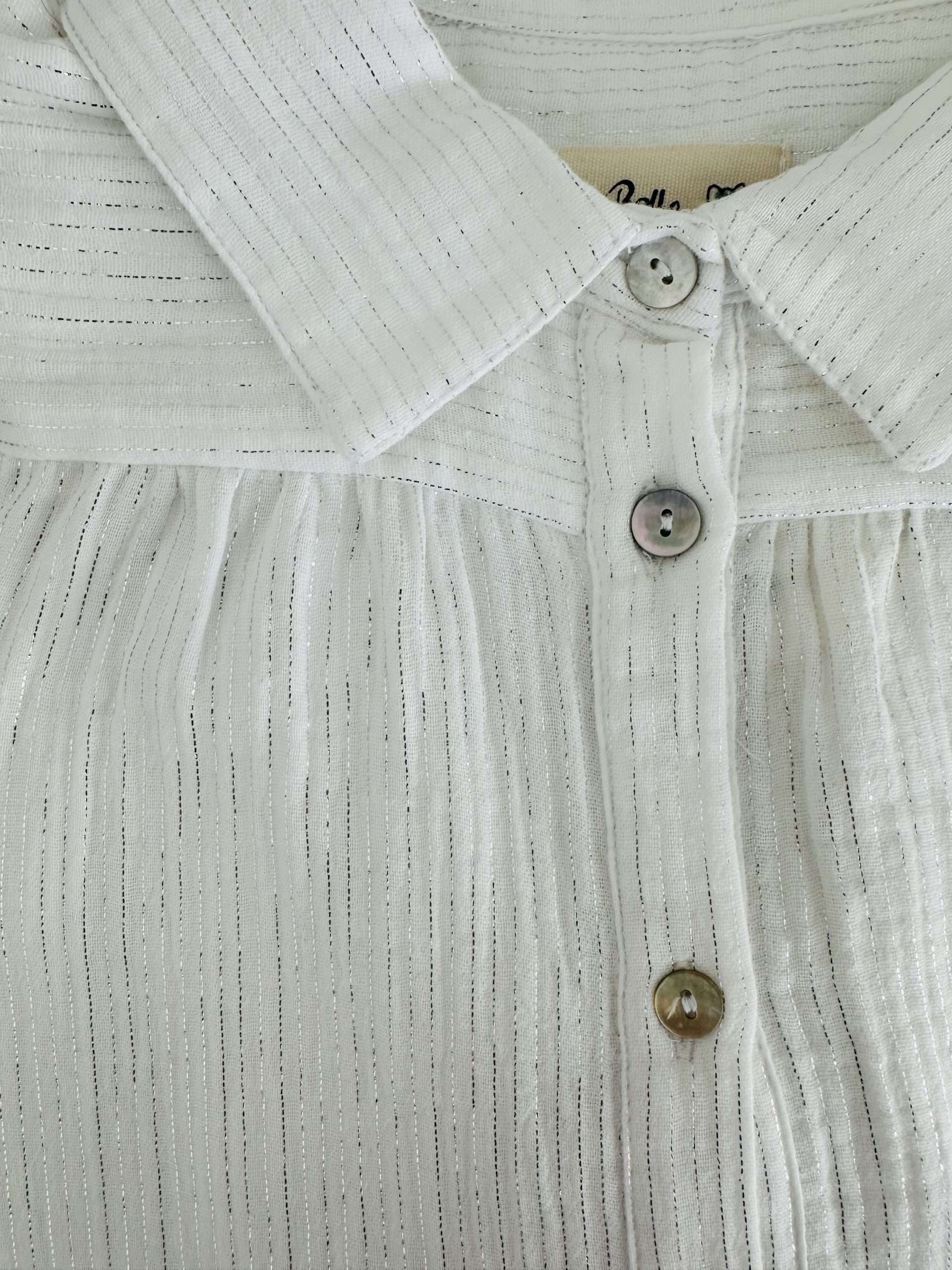 Camisa confeccionada en una bambula 100% de algodón orgánico con vivo plateado en el canesú. Cuello camisero y hombros ligeramente abullonados. Puños con cierre de botón. Tejido con certificado OEKO-TEX Standard 100
