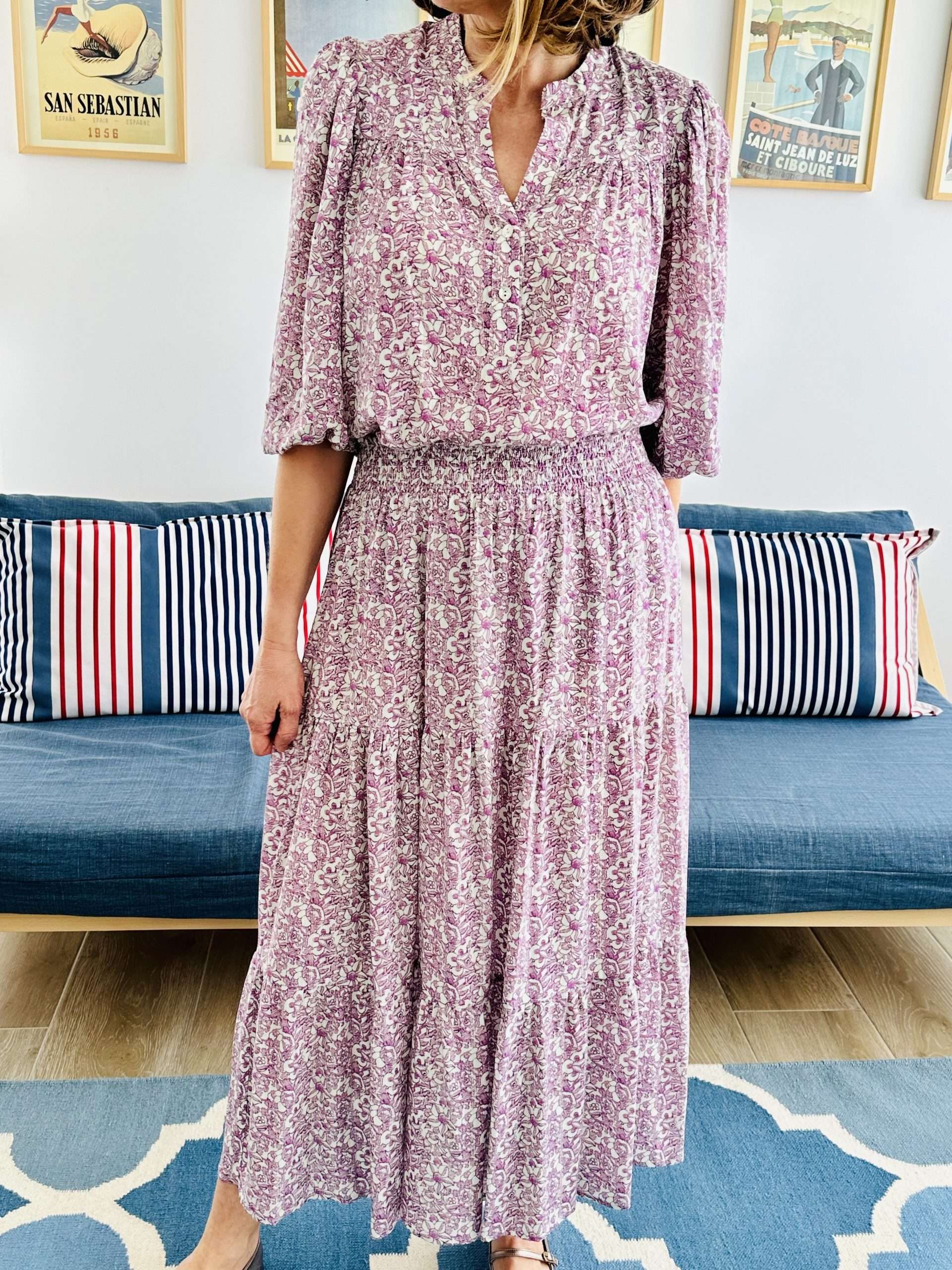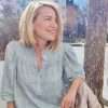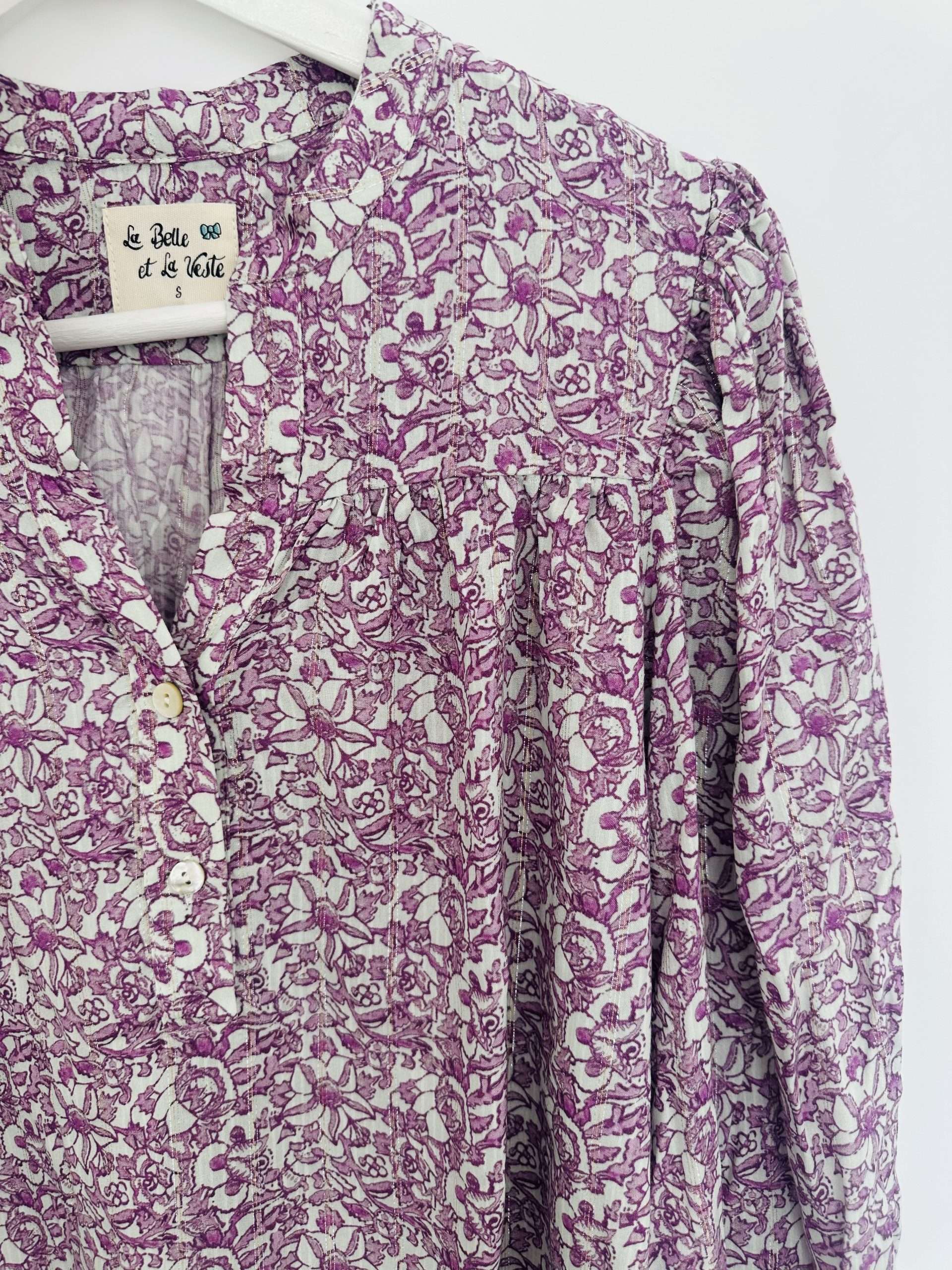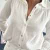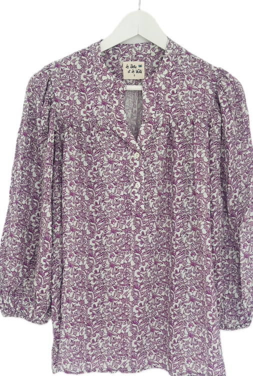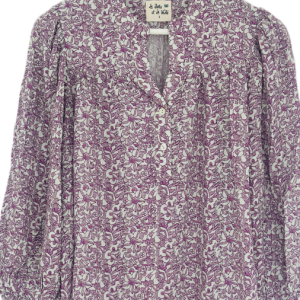 Camisa confeccionada en viscosa 100% con hilo de lúrex. Cuello redondo con cierre de botones y manga larga ligeramente abullonadas y amplias con goma elástica. Tejido con certificado OEKO-TEX Standard 100