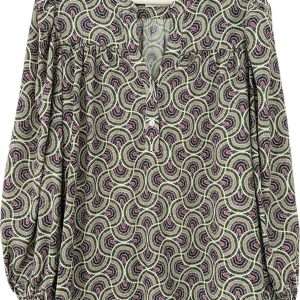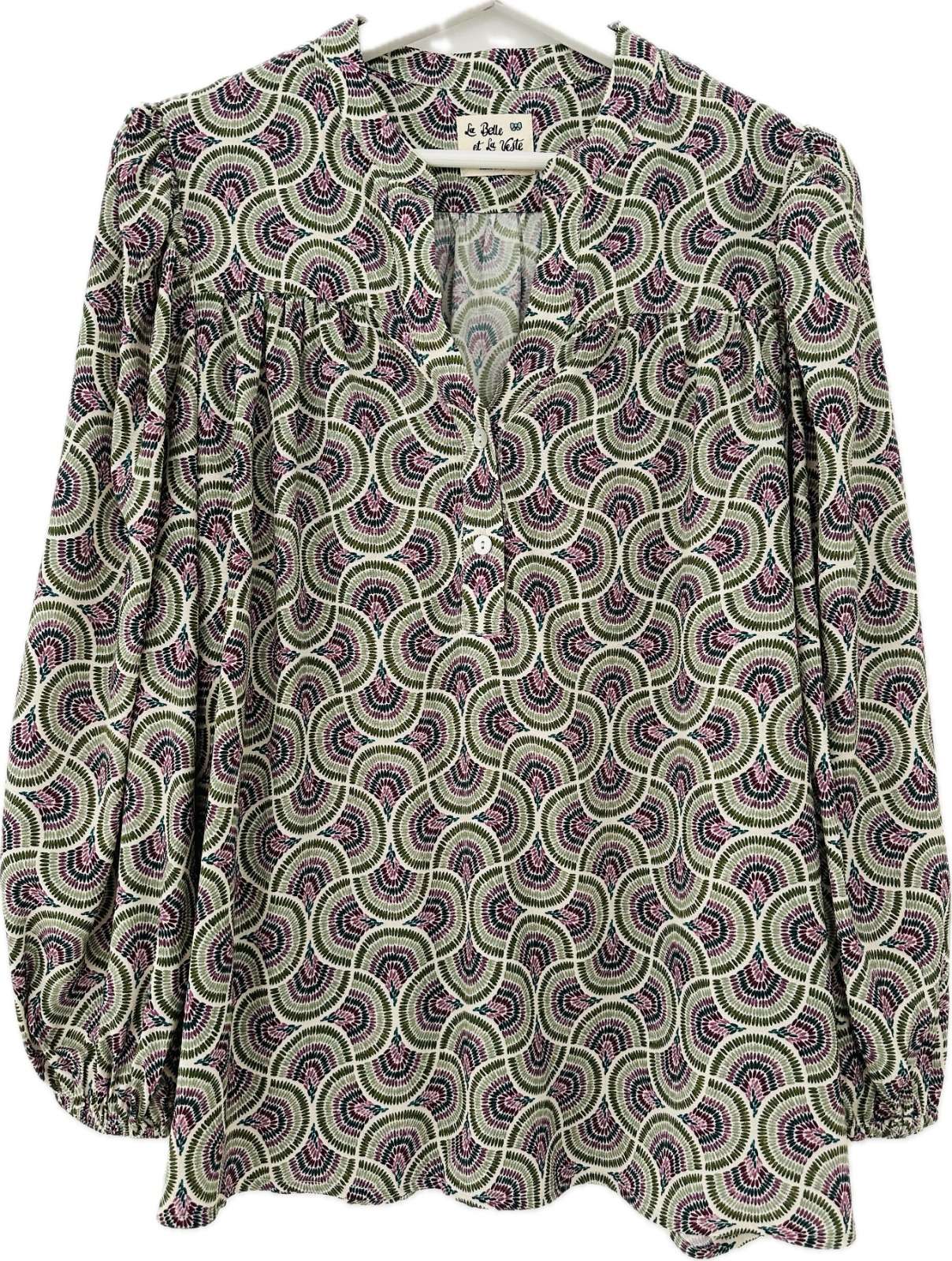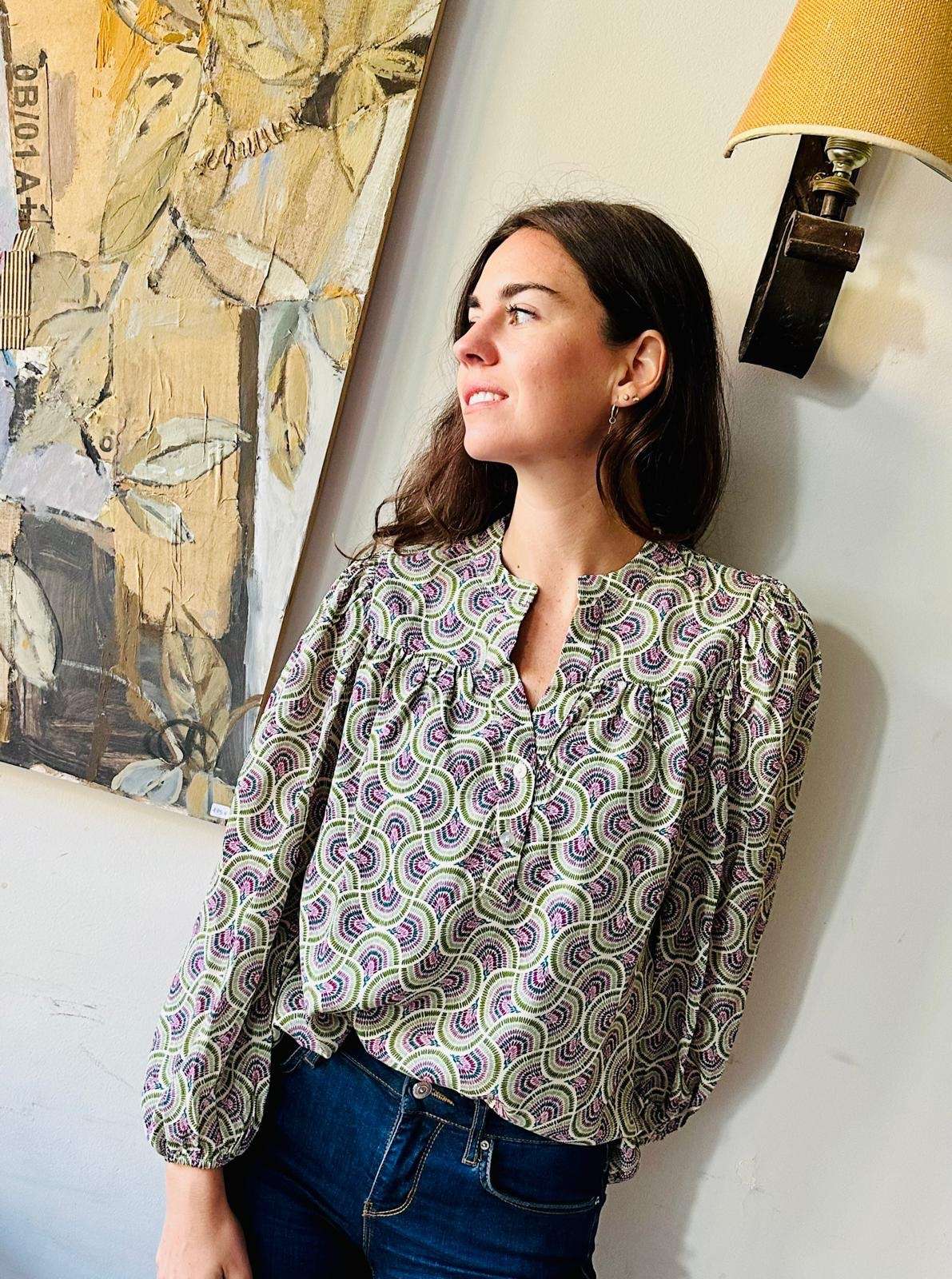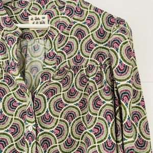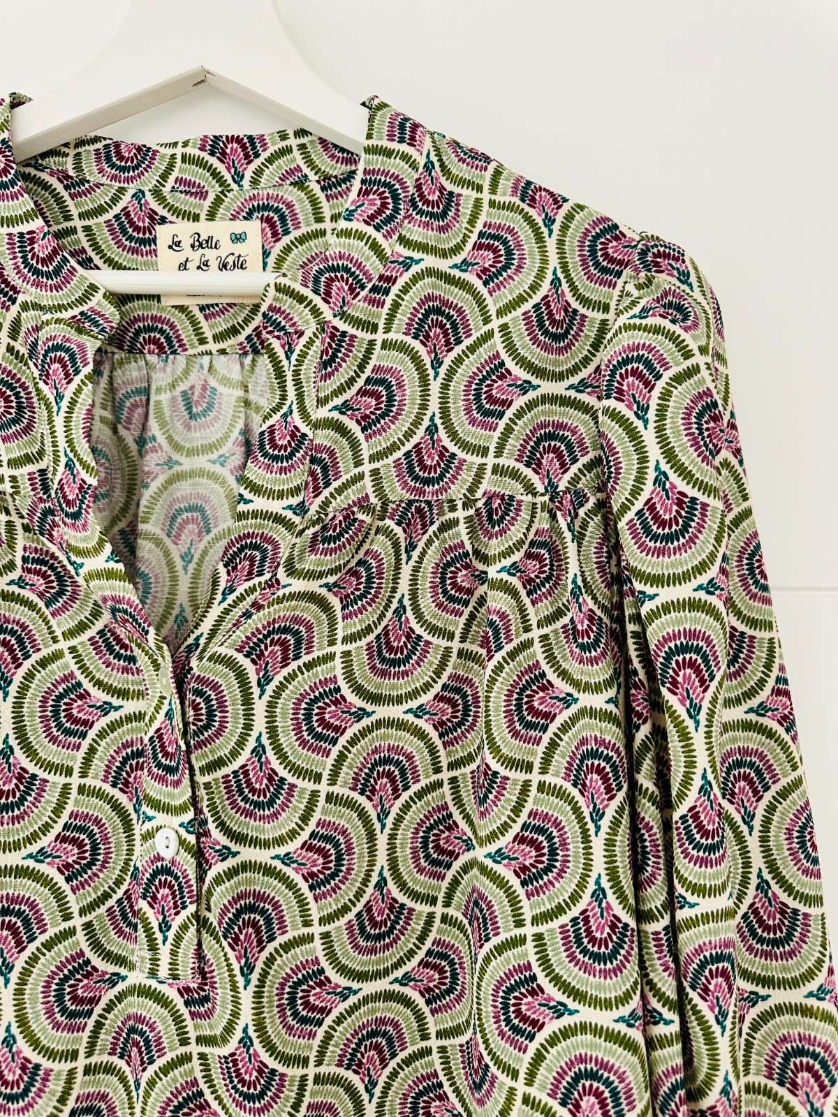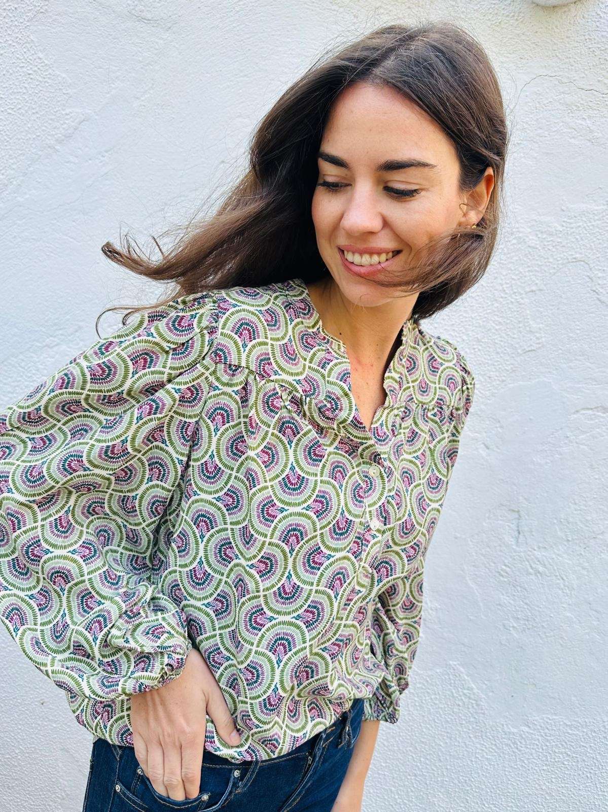 Camisa confeccionada en viscosa 100% . Cuello redondo con apertura y botones. Manga larga y amplia con goma elástica en el puño y hombros ligeramente abullonados. Tela con certificado OEKO-TEX Standard 100.