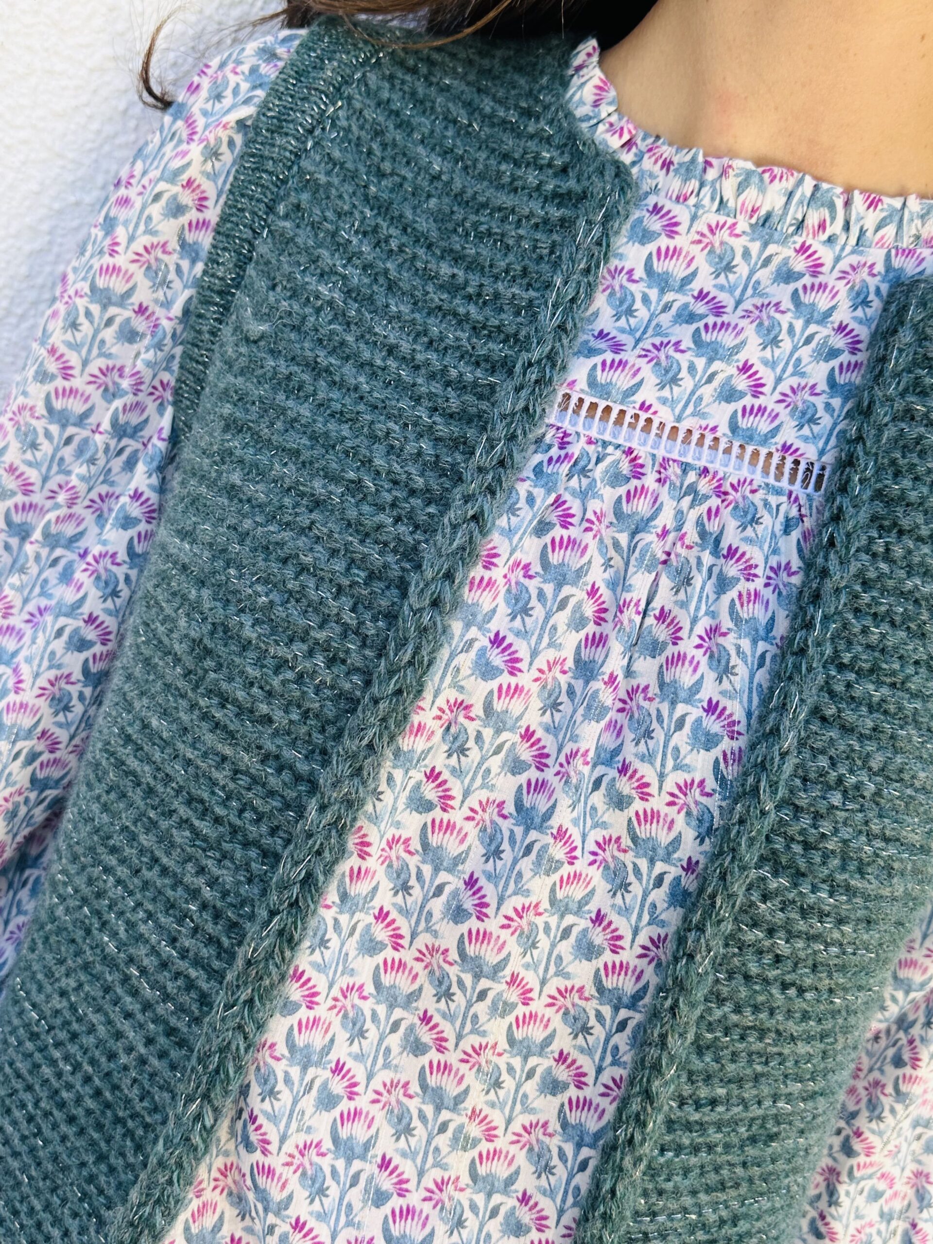 Chaleco de punto confeccionado en mezcla de lana 33% y acrílico 67%, con hilo de lúrex. Ideal para llevar encima de cualquier camisa o blusa y darle al look un toque más cálido.