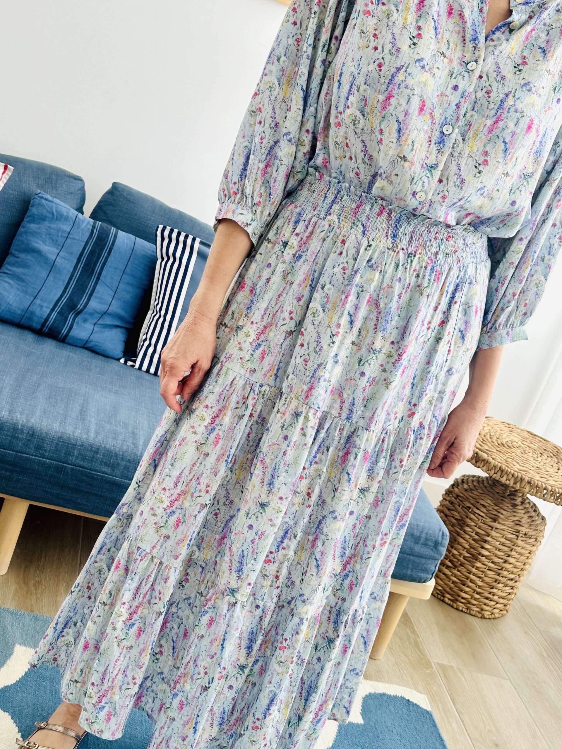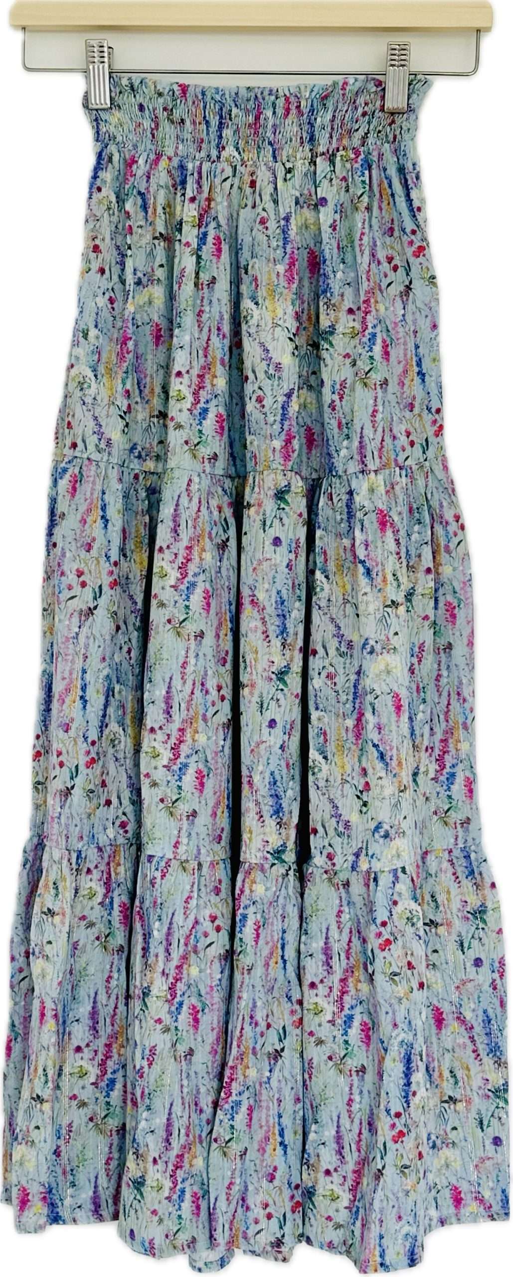 Falda larga fluida de tres paneles confeccionada en viscosa 100% con hilo de luerx. Cinturilla elástica ancha para mayor comodidad y adaptación. Tejido con certificado OEKO-Tex Standard 100.