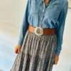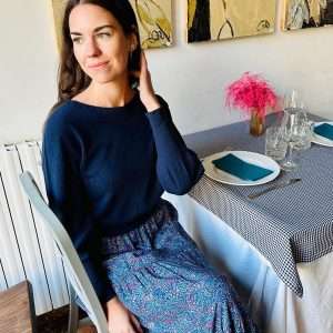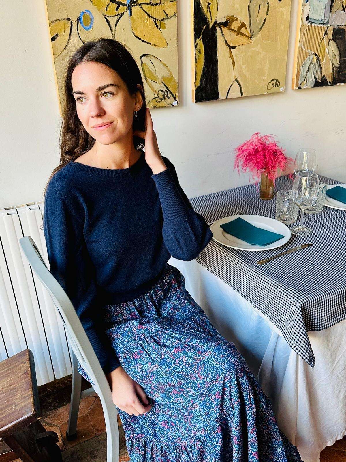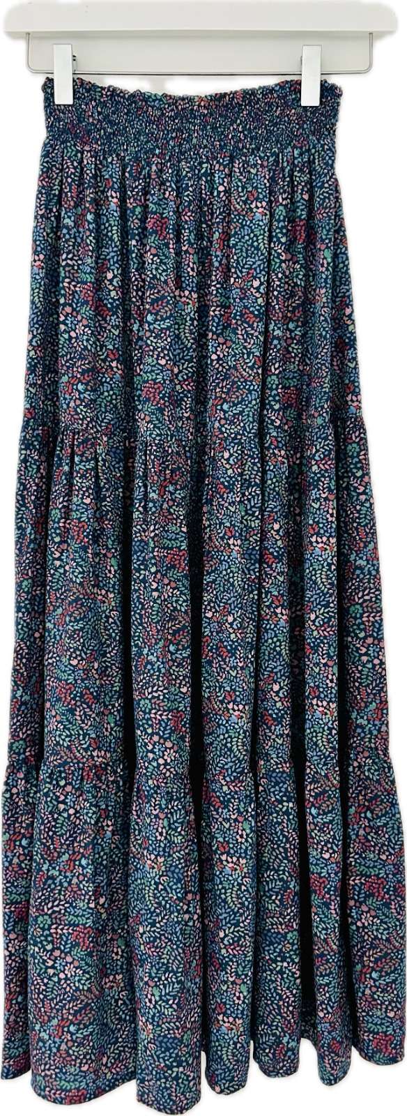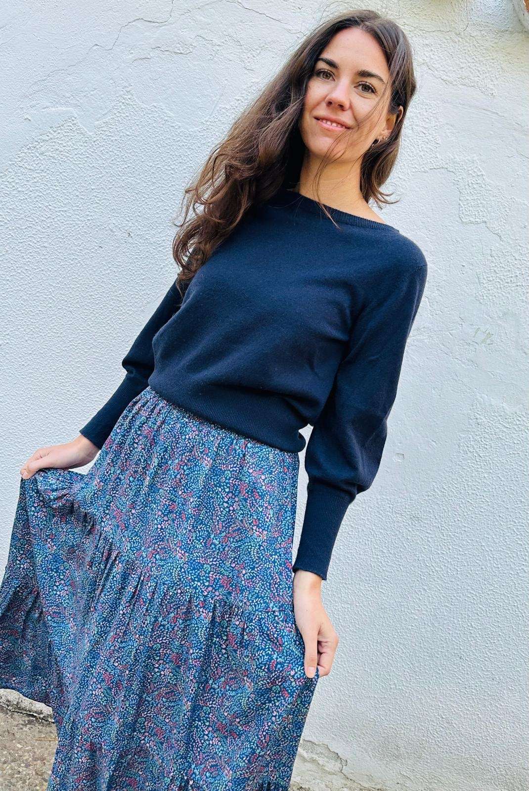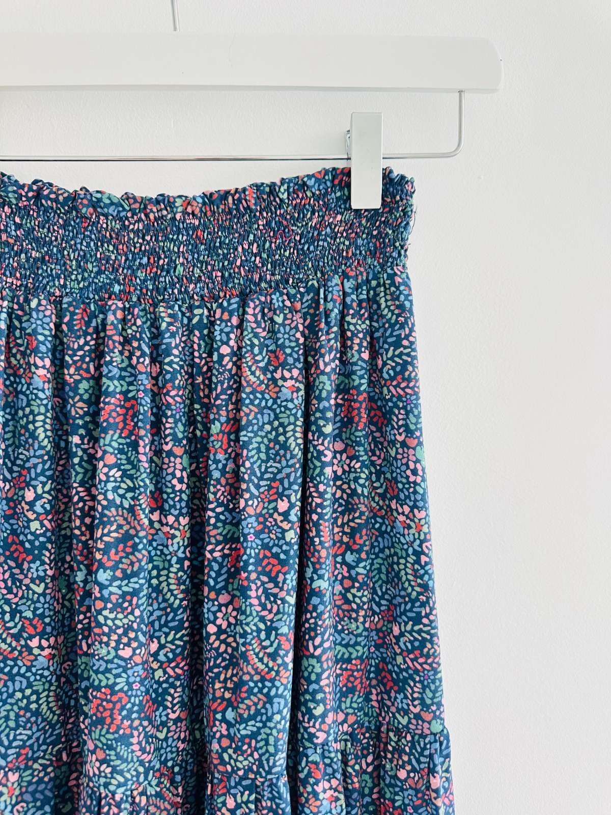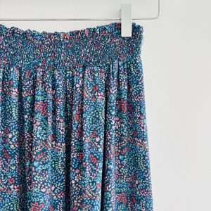 Falda larga fluida de tres paneles confeccionada en viscosa 100%. Cinturilla elástica ancha para mayor comodidad y adaptación. Tejido con certificado OEKO-Tex Standard 100
