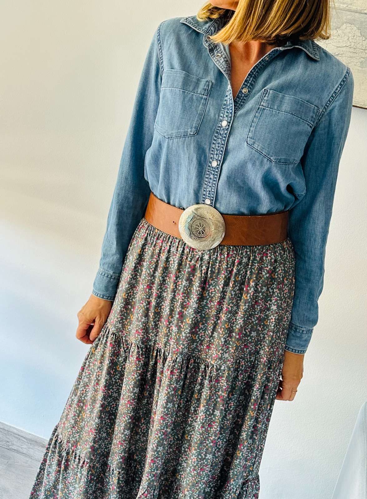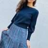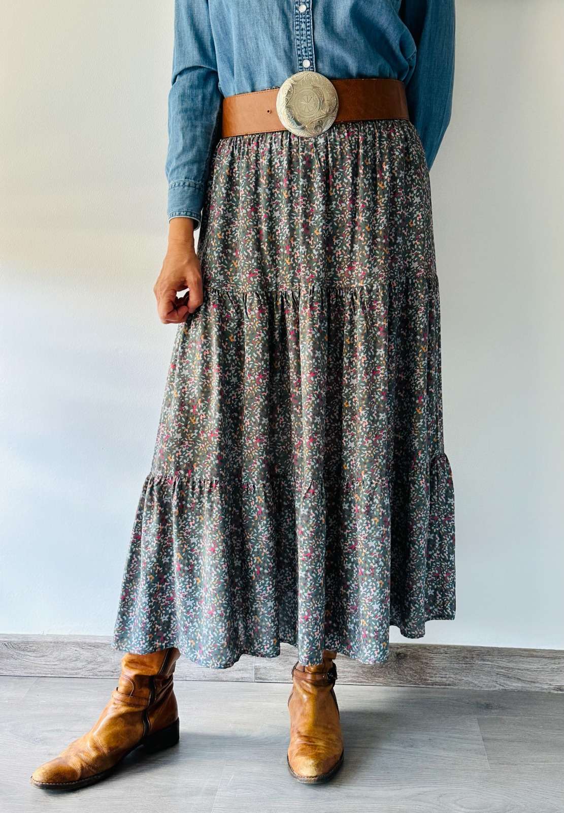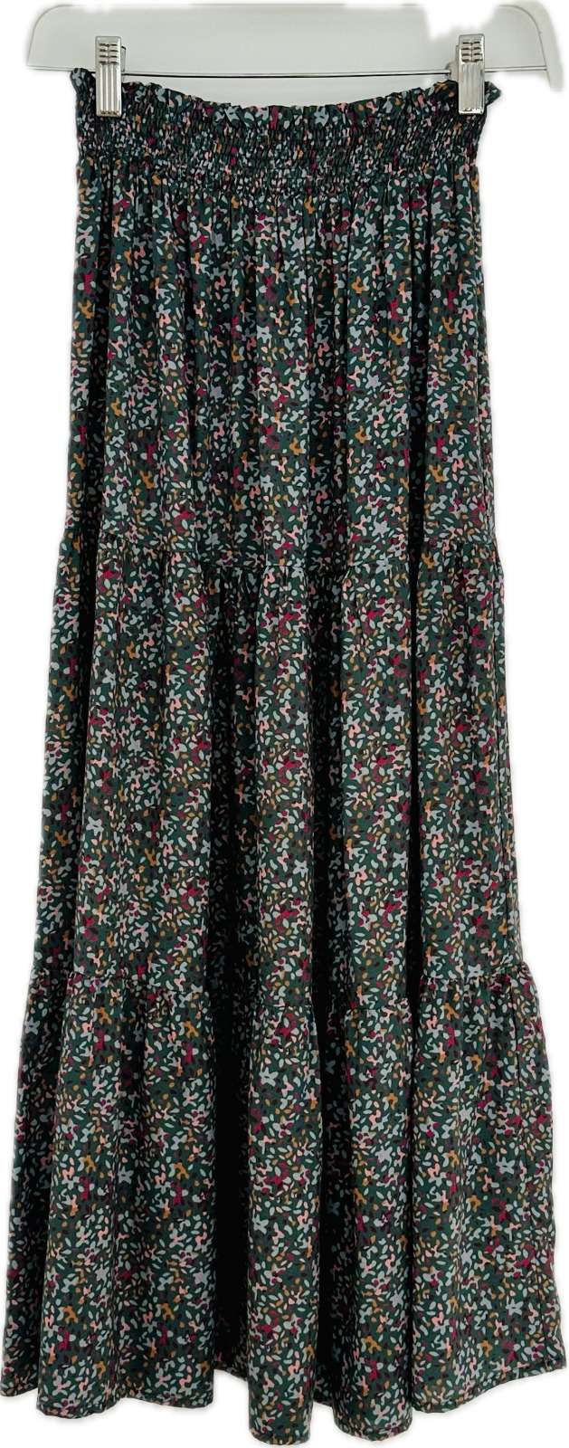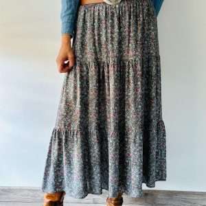 Falda larga fluida de tres paneles confeccionada en viscosa 100%. Cinturilla elástica ancha para mayor comodidad y adaptación. Tejido con certificado OEKO-Tex Standard 100
