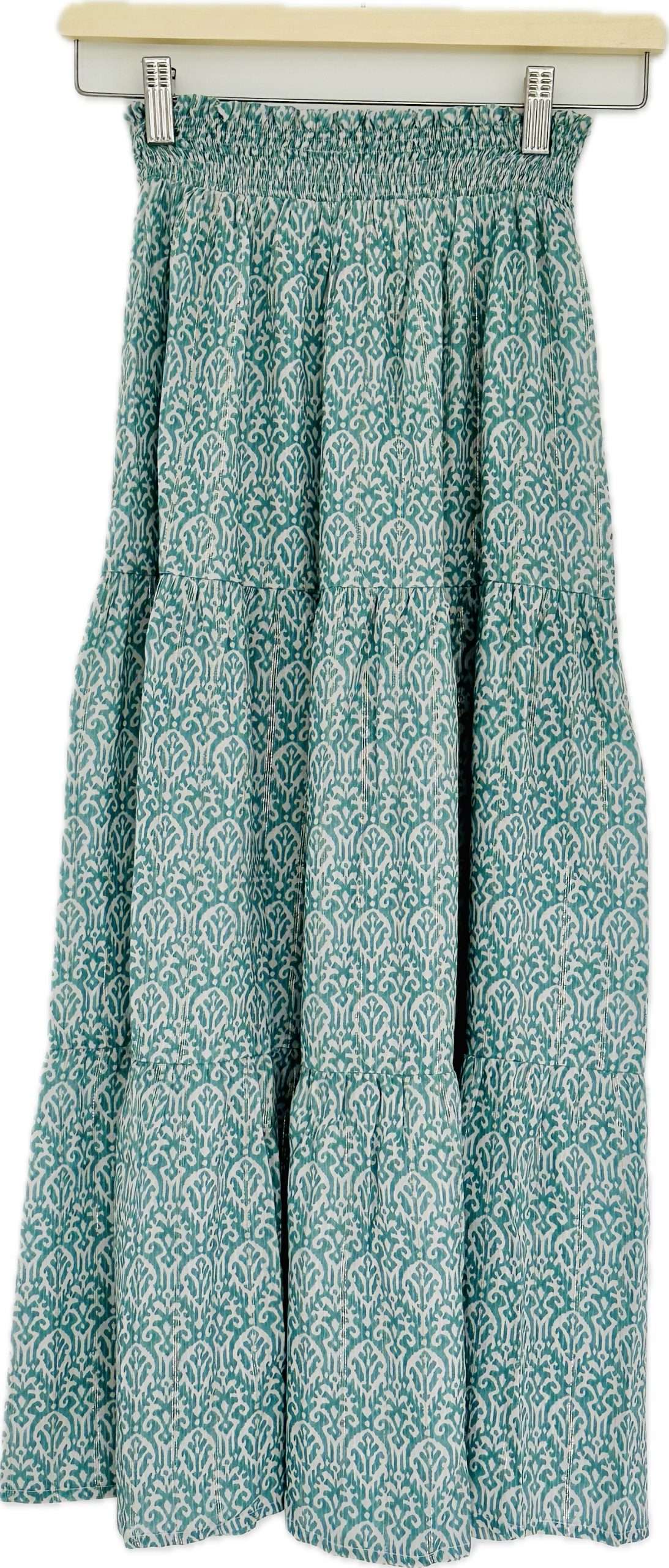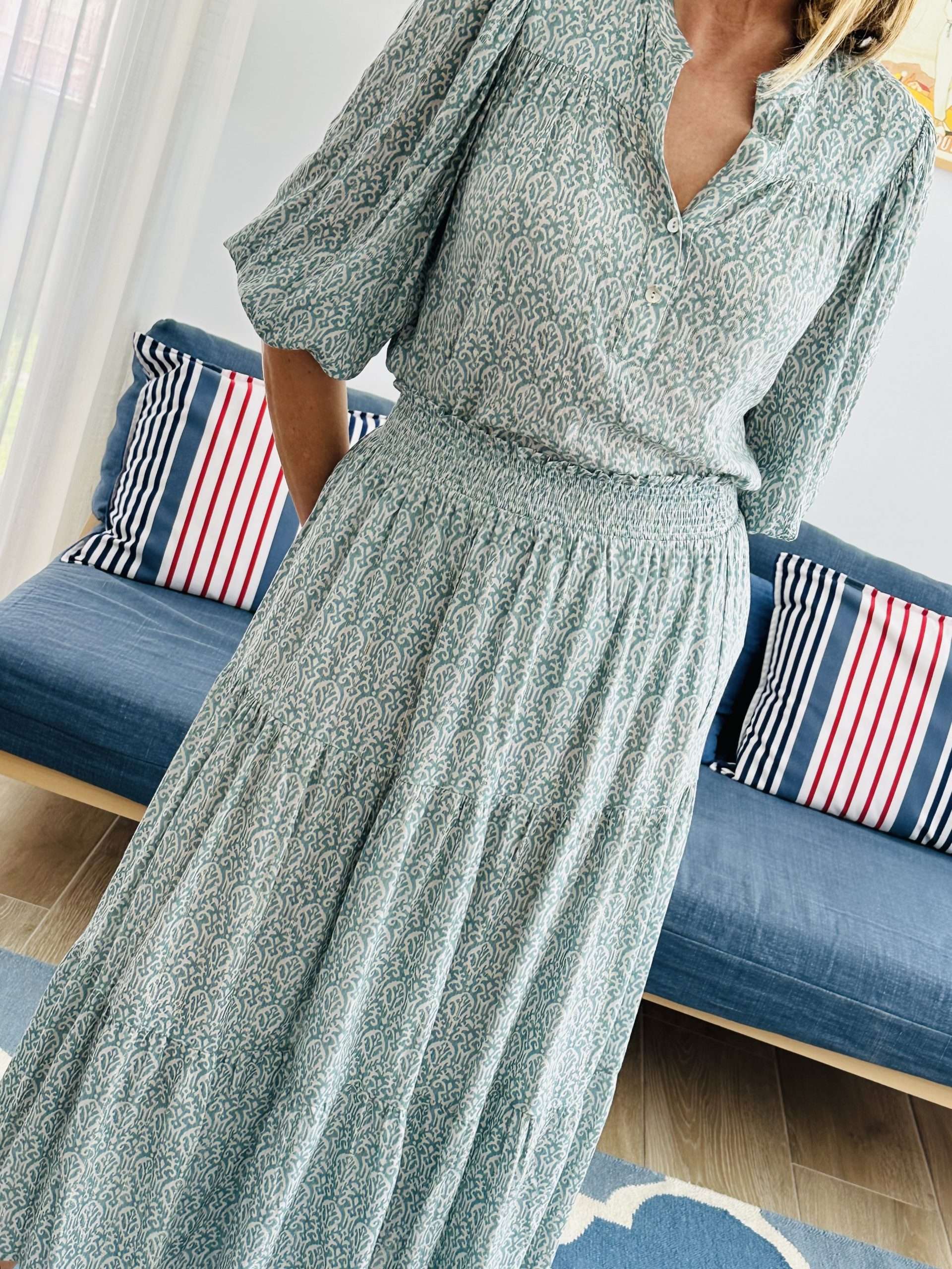 Falda larga fluida de tres paneles confeccionada en viscosa 100% con hilo de luerx. Cinturilla elástica ancha para mayor comodidad y adaptación. Tejido con certificado OEKO-Tex Standard 100.