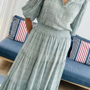 Falda larga fluida de tres paneles confeccionada en viscosa 100% con hilo de luerx. Cinturilla elástica ancha para mayor comodidad y adaptación. Tejido con certificado OEKO-Tex Standard 100.