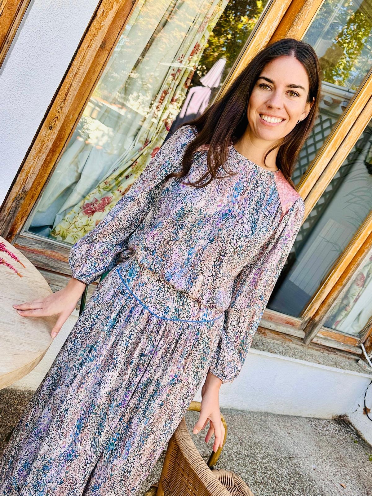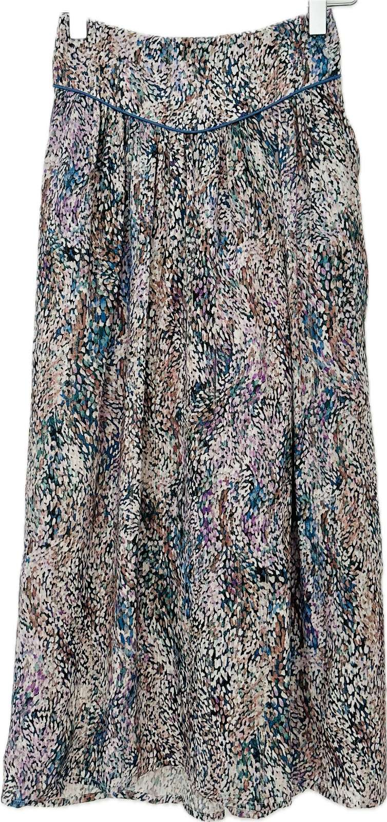 Falda Midi confeccionada en viscosa 100% con bolsillos laterales y cintura fruncida elástica en la parte trasera. Canesú delantero ribeteado con un vivo. Tela con certificado OEKO-TEX Standard 100.