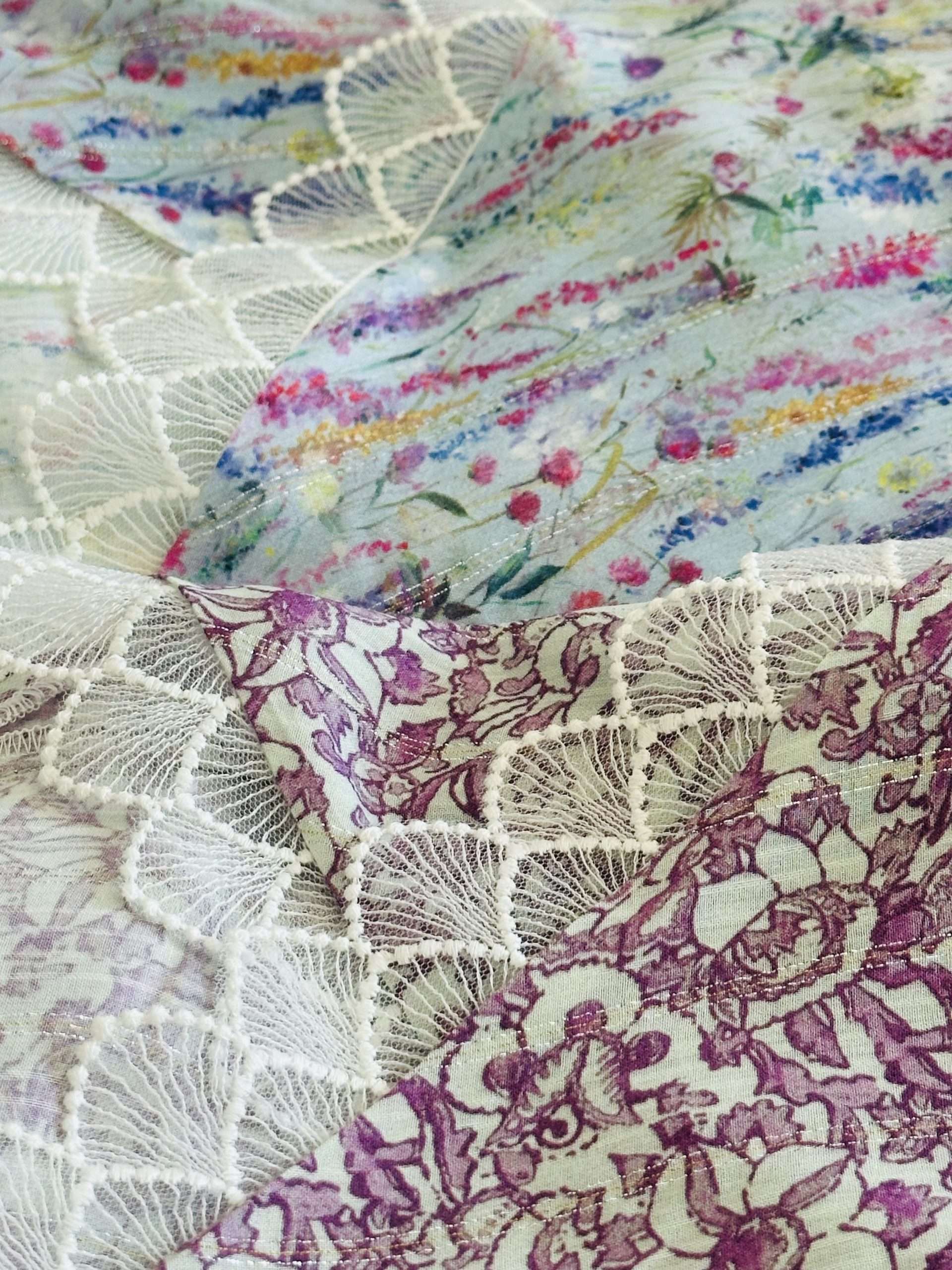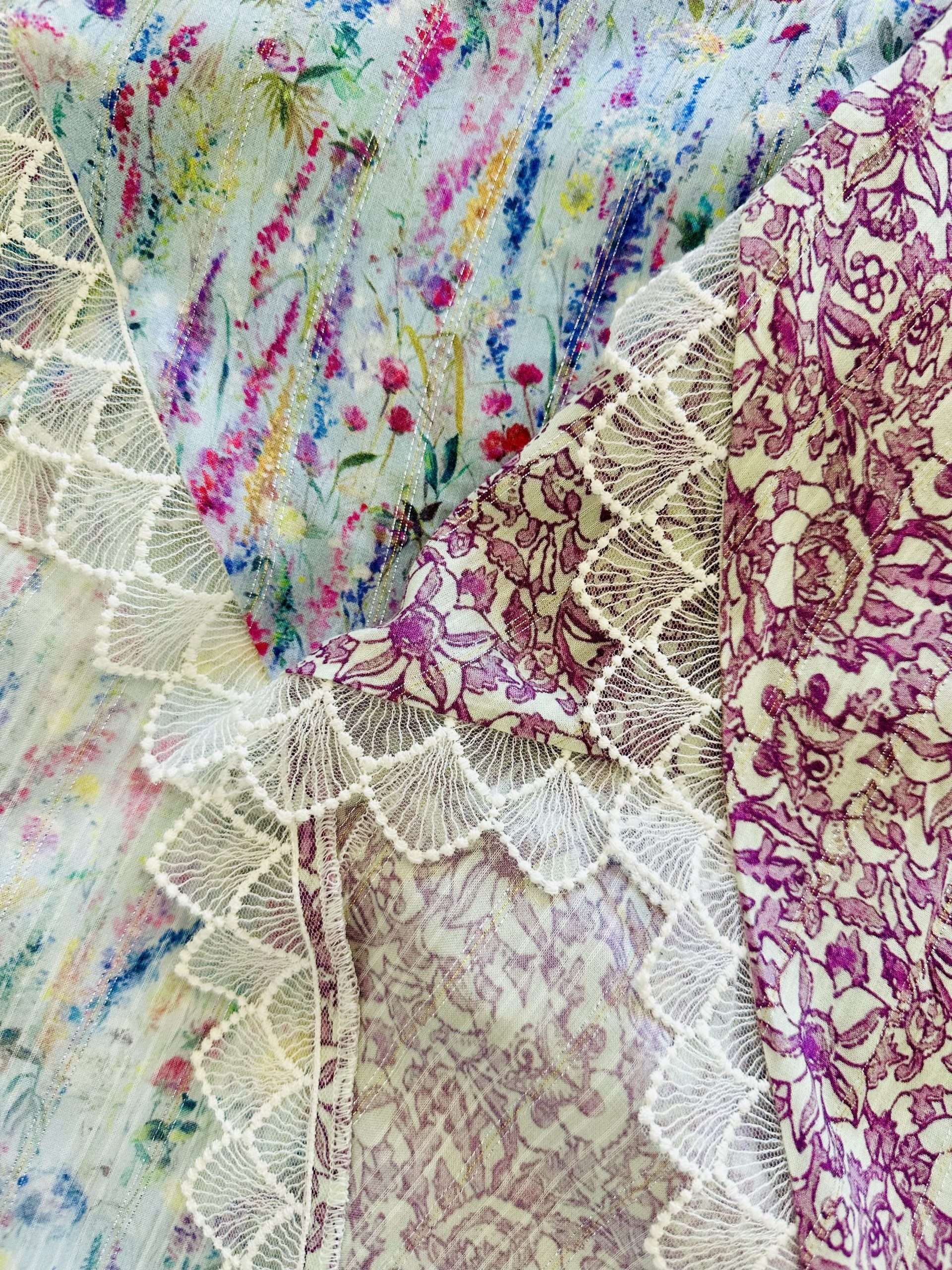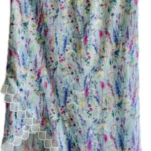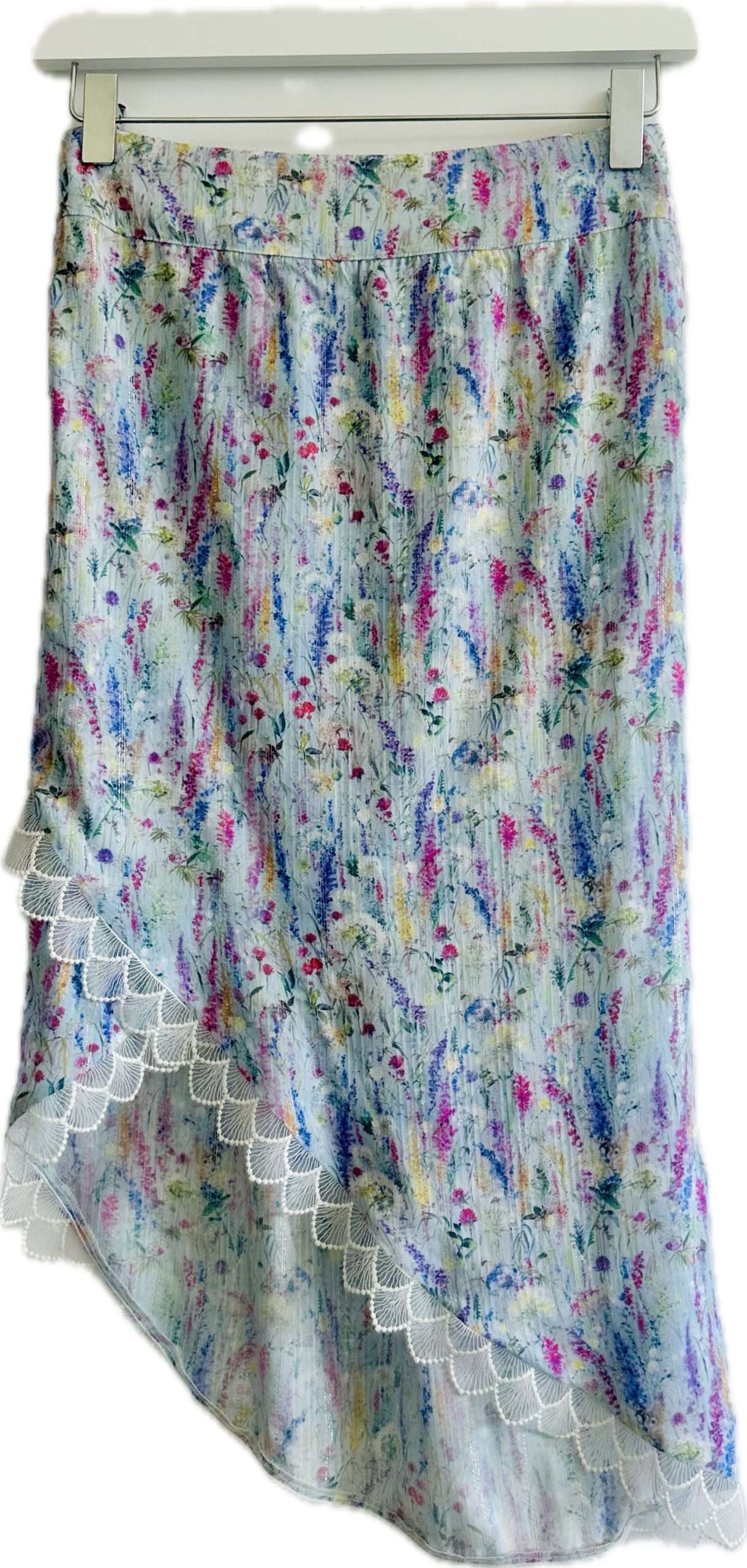 Falda Midi de corte recto y bajo asimétrico, con un fino encaje de tul a lo largo del bajo. Confeccionada con viscosa 100% con hilo de lurex. Cintura con goma elástica en la parte trasera. Ligera, femenina y fresca.