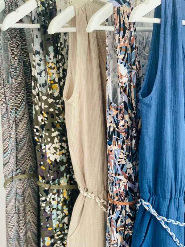 Mono Austen Viscosa, confeccionado con tejido 95% viscosa y 5% spandex. Escote en pico de corte cruzado en la parte delantera. Sin mangas. Cinturilla ligeramente fruncida con goma elástica, con un cinturón fino trenzado de cuero como complemento. Bolsillos. Bajo de la pierna rematado con goma elástica en el tobillo. Disponible en distintos estampados.