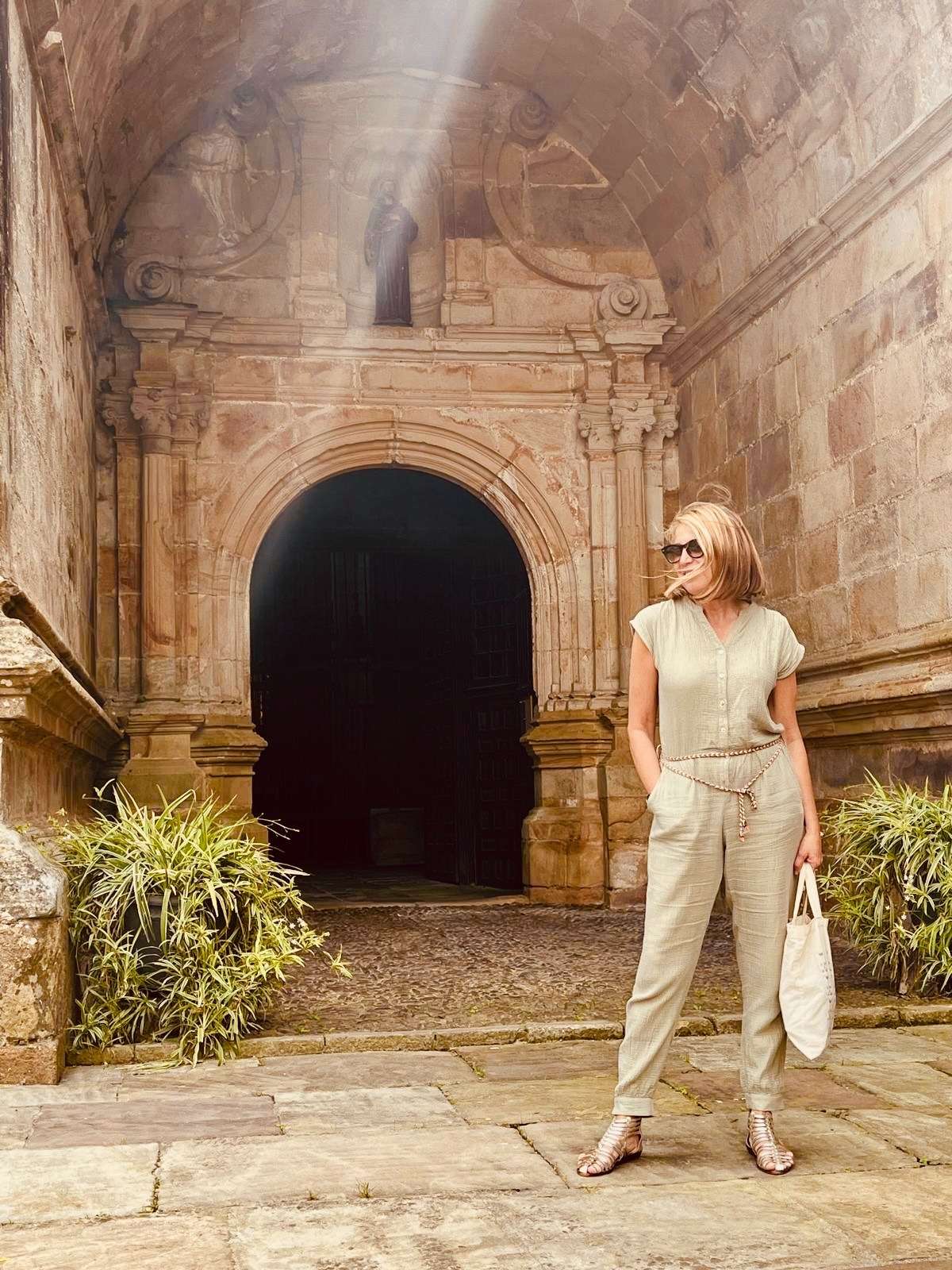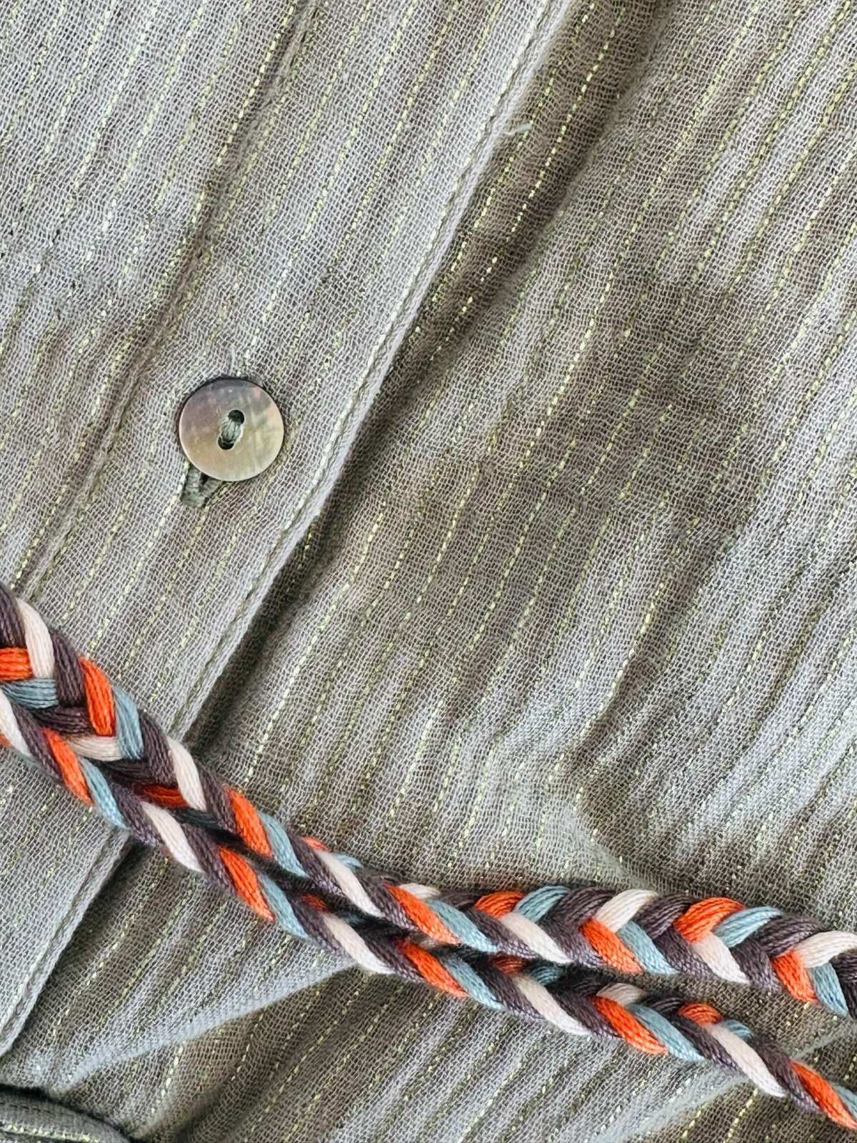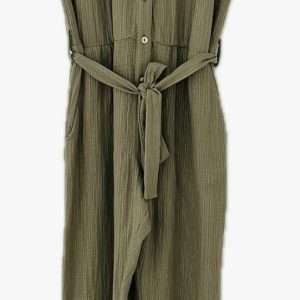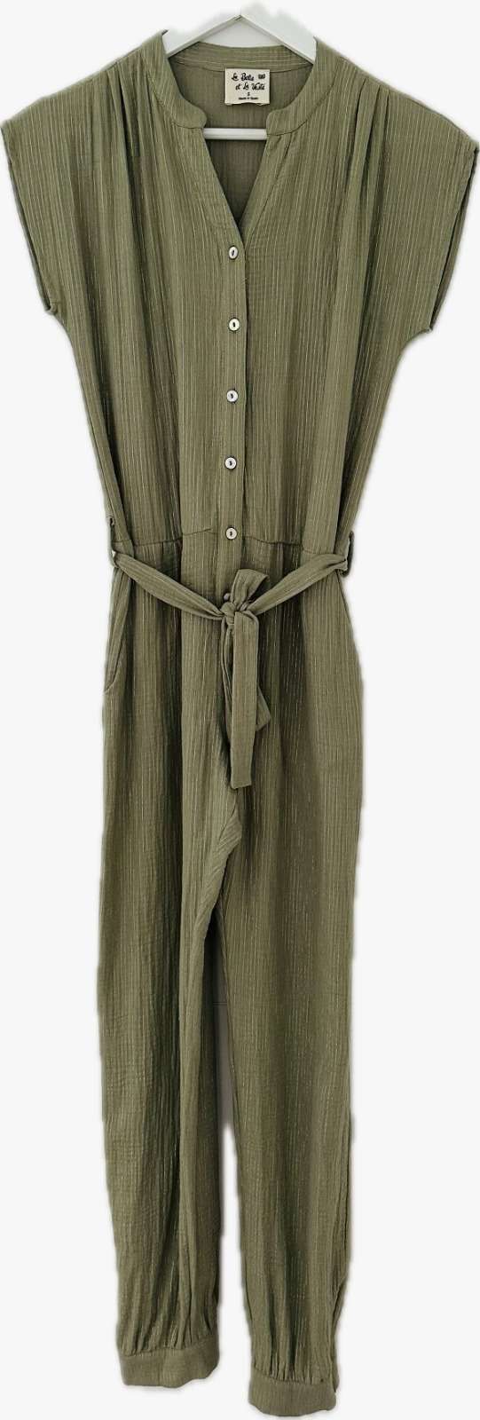 Nuestro clásico mono de la primera colección de La Belle et la Veste en un nuevo estampado. Confeccionado en bambula 100% algodón de color verde kaki con rayas de lurex dorada. Cuello con abertura frontal y abotonado. Manga estilo hombro caído con cinturón del mismo tejido asi como trenzado de colores. Cremallera en los tobillos.