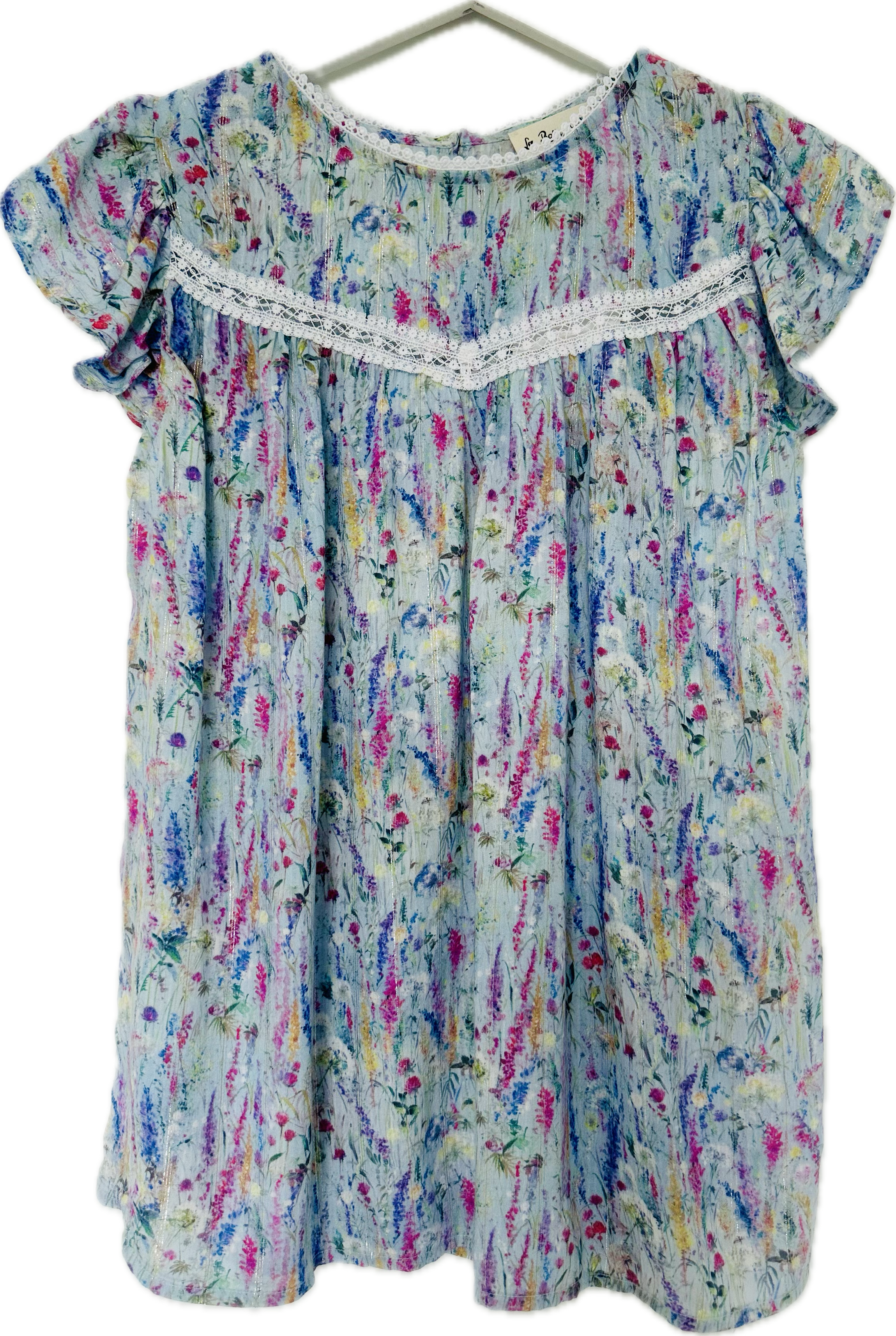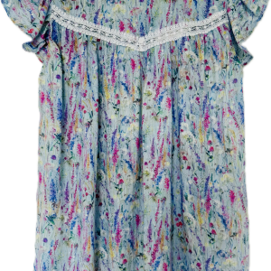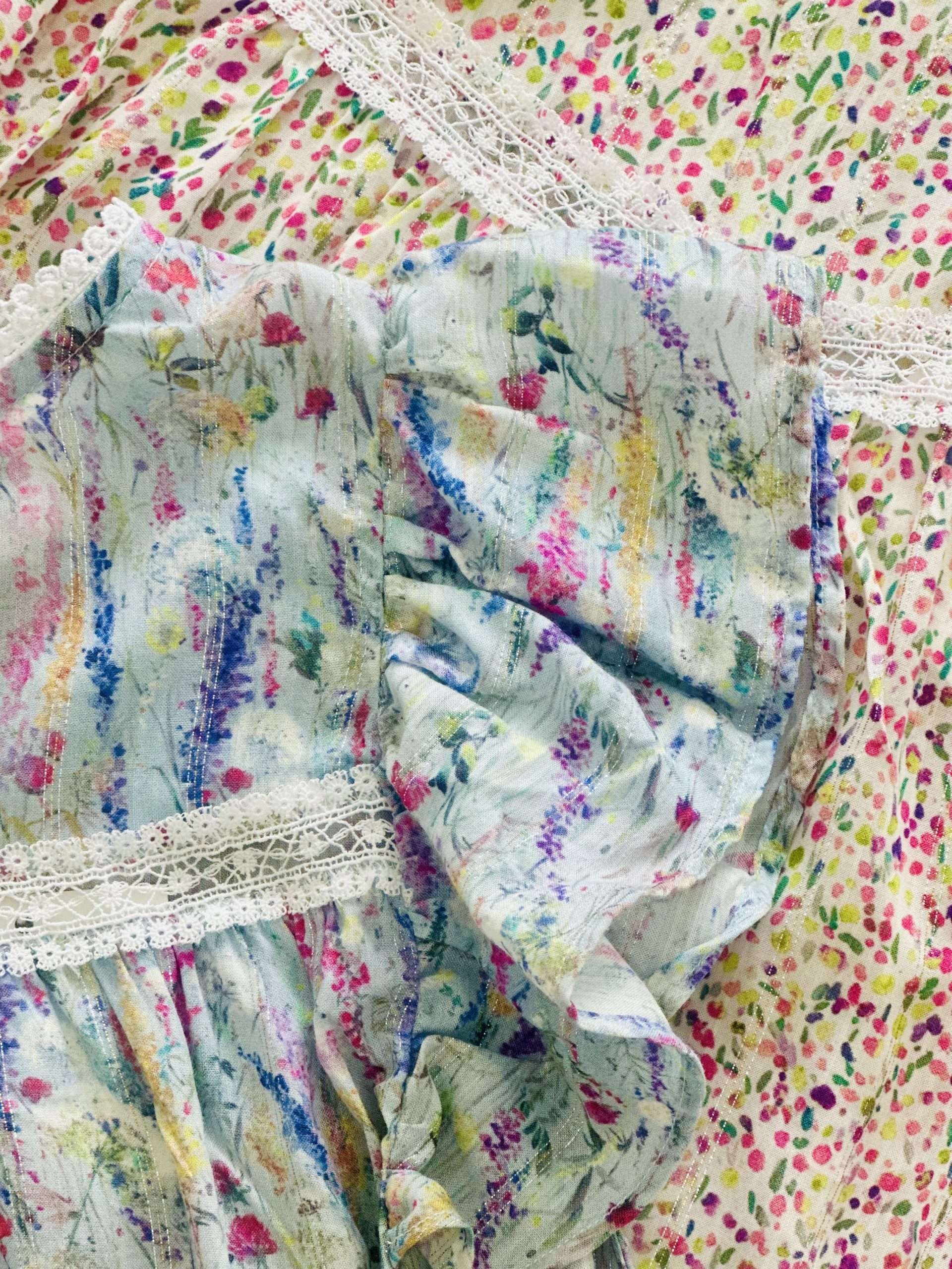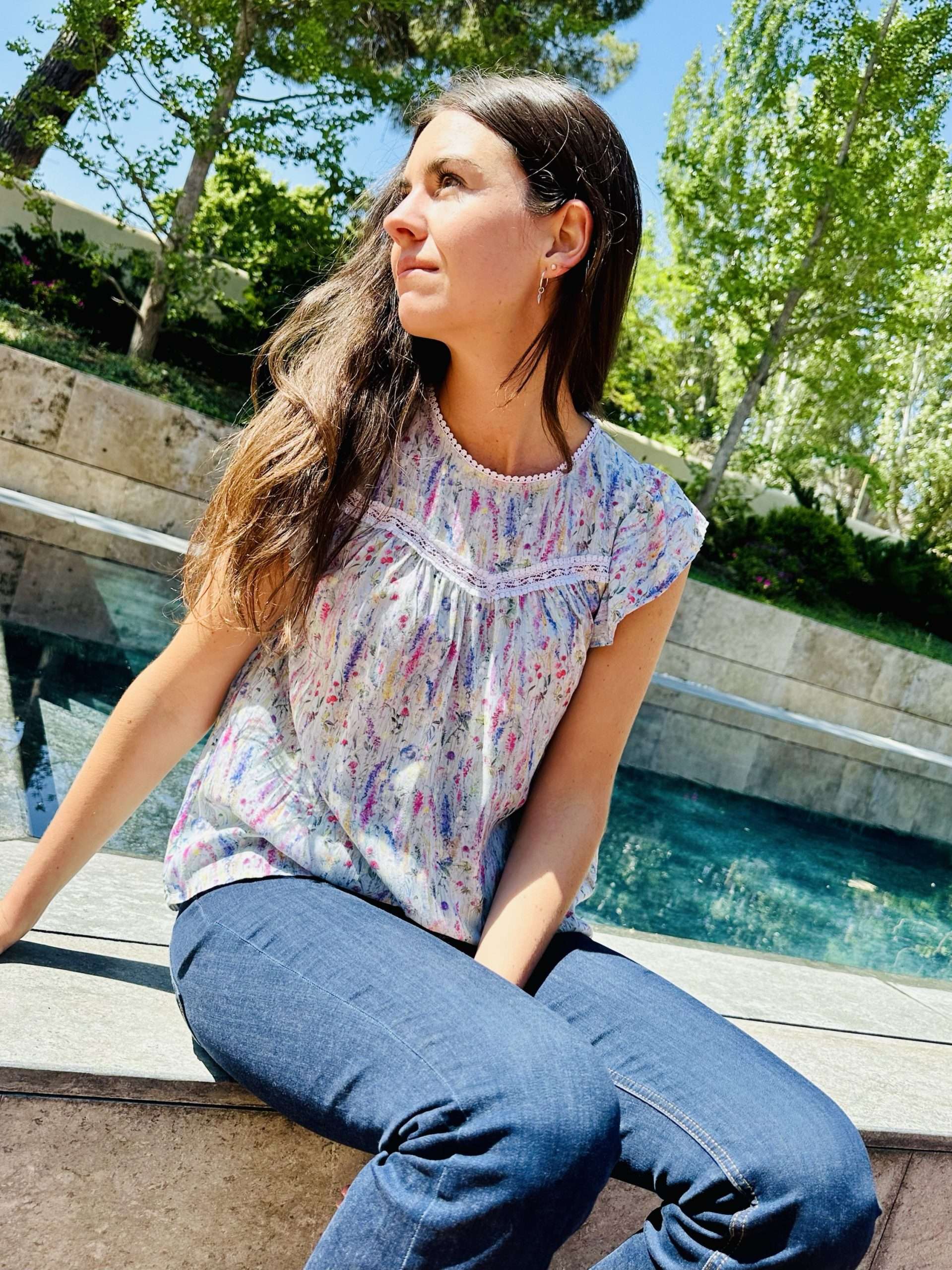 Top ligero y fluido confeccionado en viscosa 100% con hilo de lurex. Manga corta con volante. Cuello redondo y pechera en pico ribeteada con un encaje de guipur. Apertura con botón en la espalda. Tela con certificado OEKO-TEX Standard 100. Disponible en dos estampados.