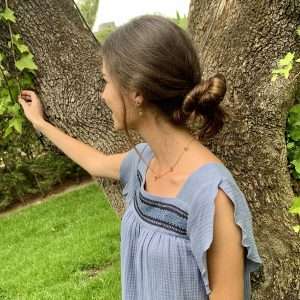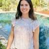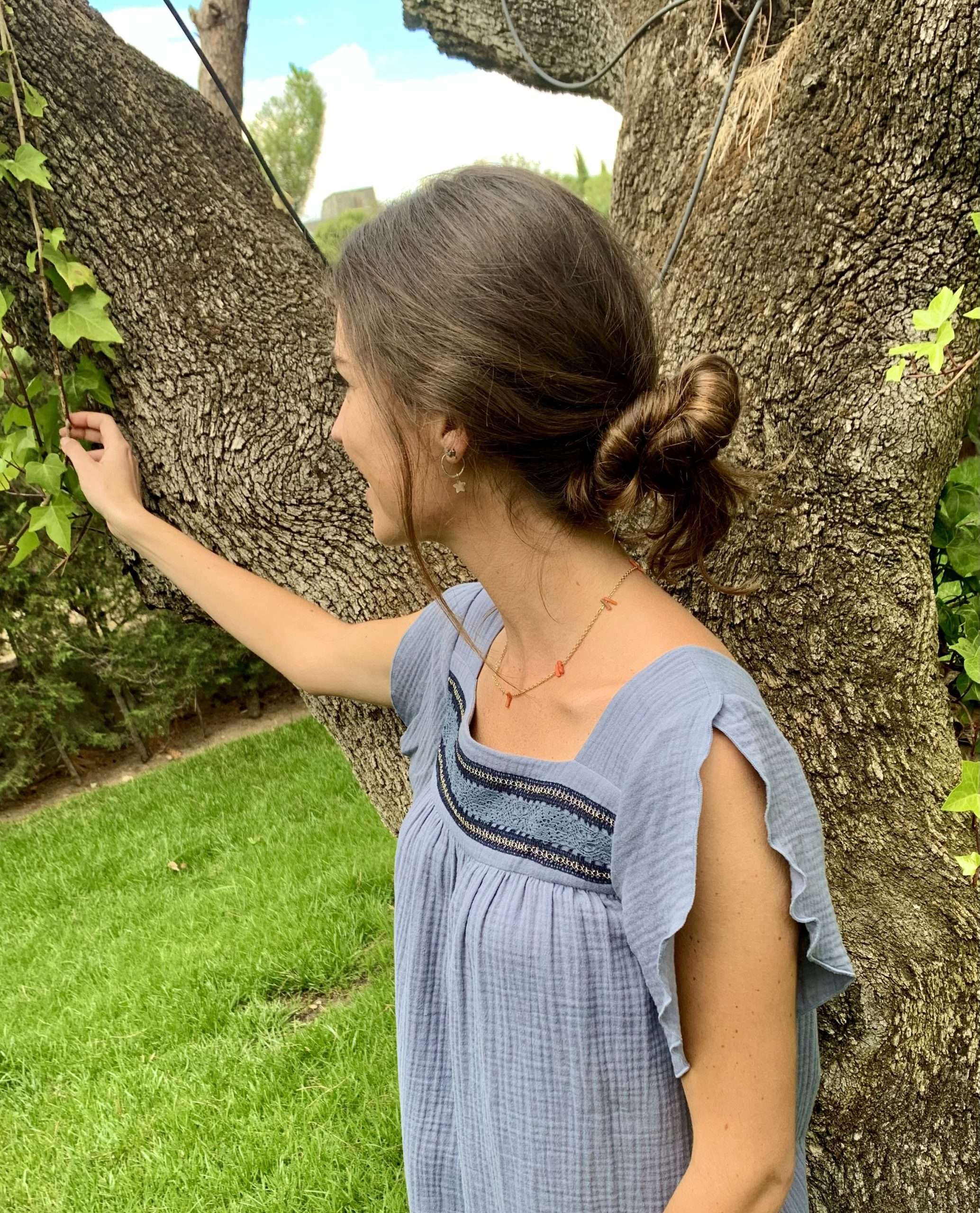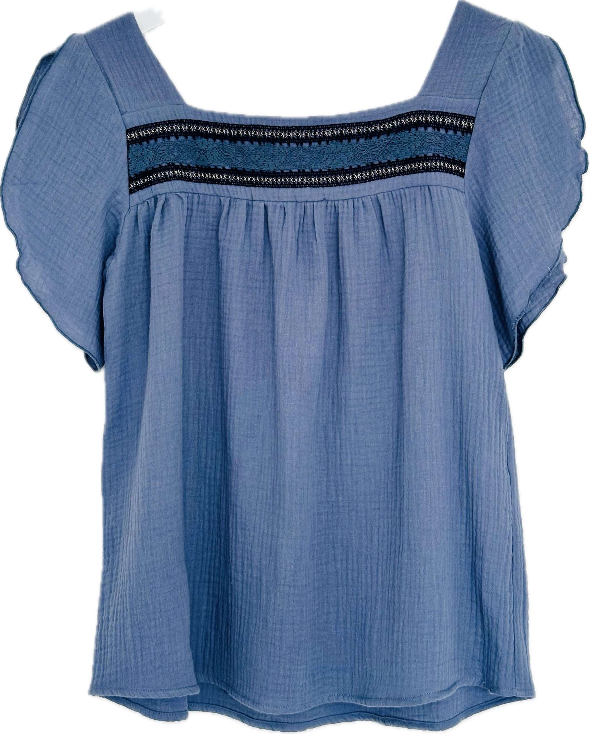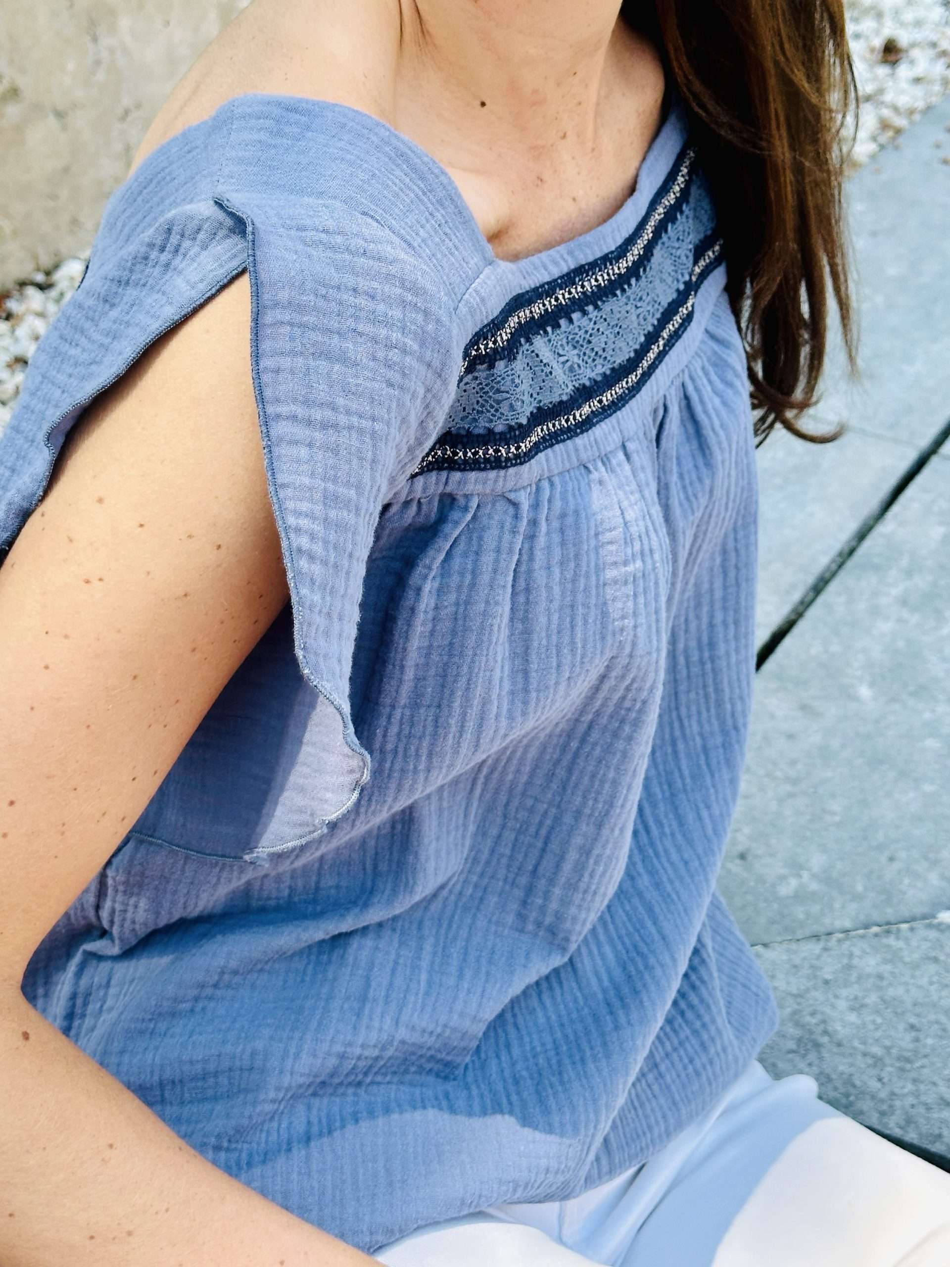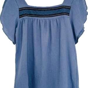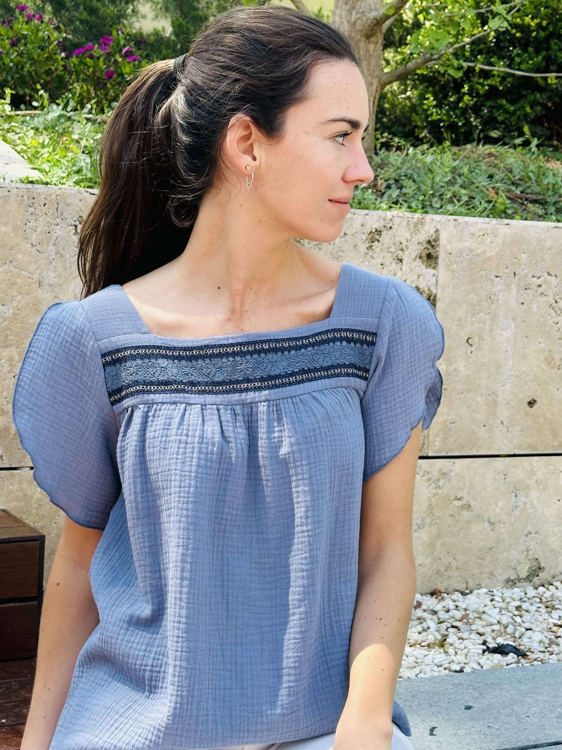 Top confeccionado en una bambula 100% de algodón orgánico con escote cuadrado y encaje a lo largo del mismo. Manga corta tipo “tulipán” con apertura. Tejido con certificado OEKO-TEX Standard 100