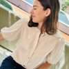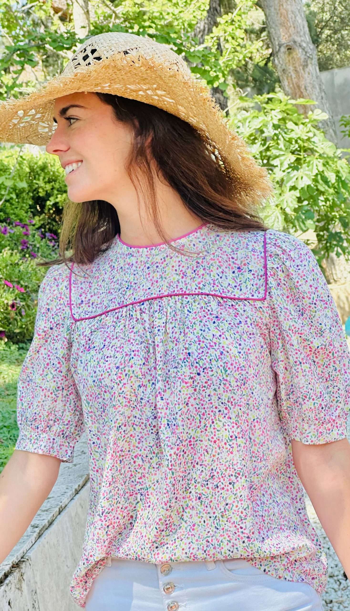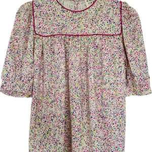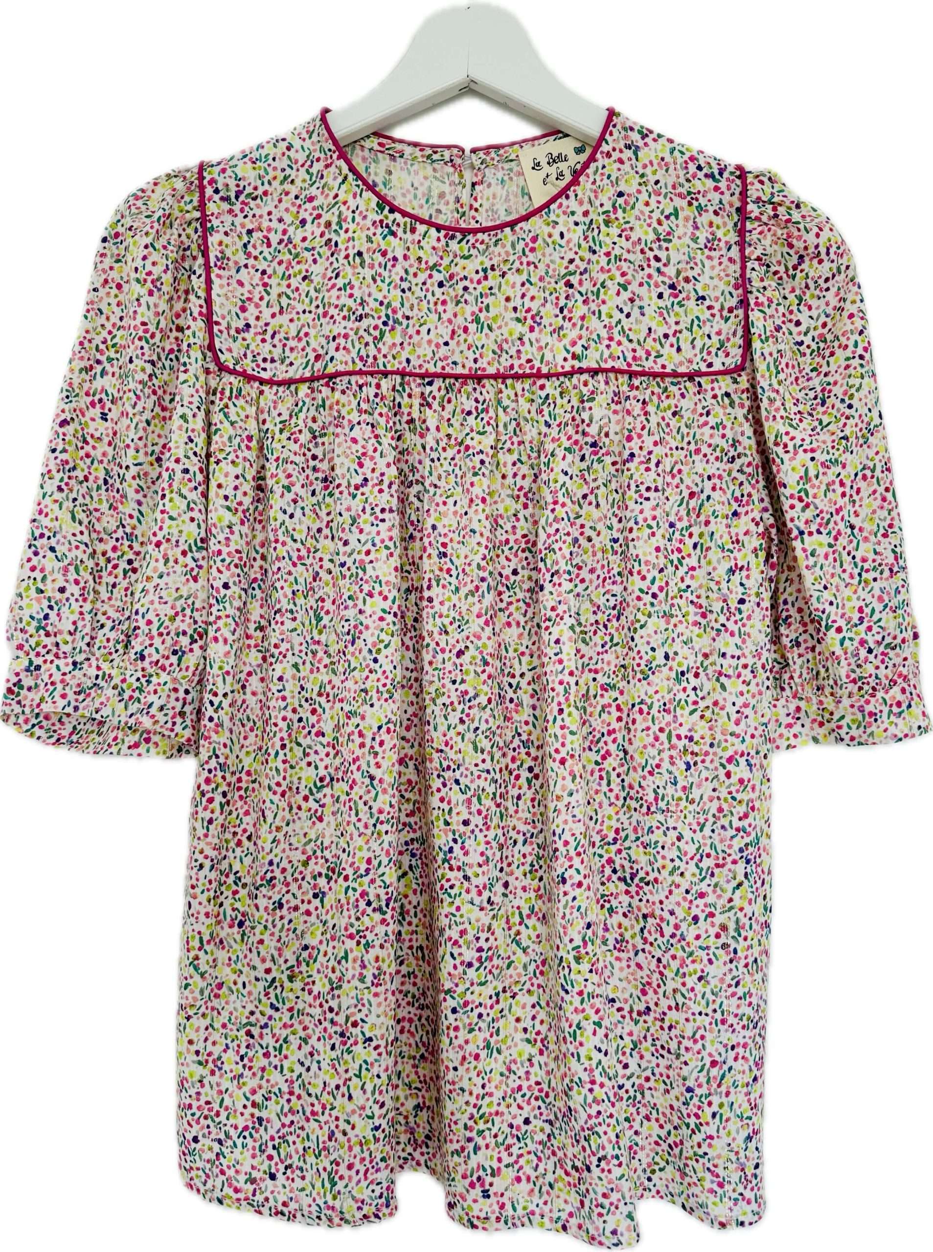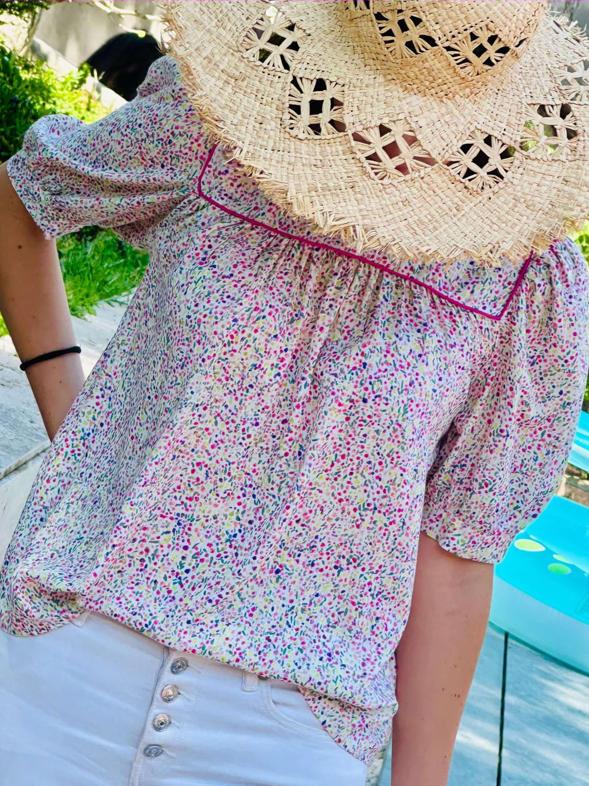 Ligera y fluida con manga corta ligeramente abullonada, confeccionada en viscosa estampada con hilo de lúrex. Cuello redondo con pechera ribeteada con un vivo al igual que el cuello. Apertura con botón en la espalda. Tela con certificado OEKO-TEX Standard 100.
