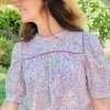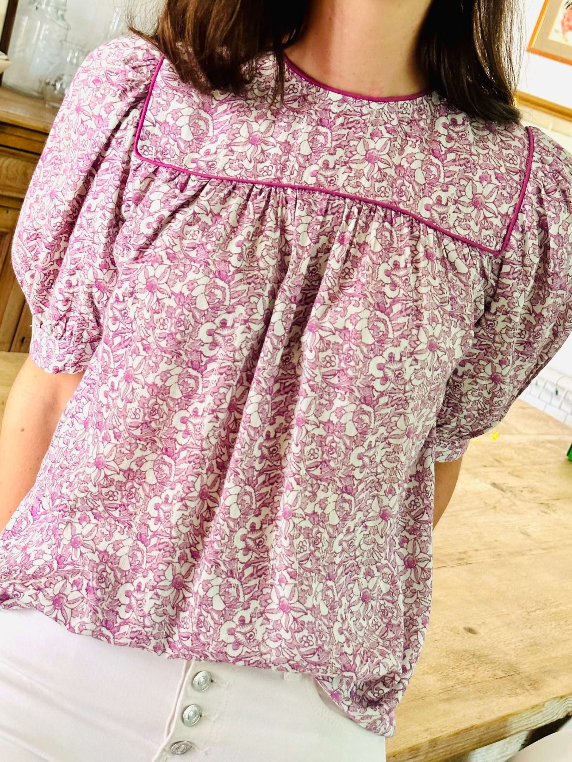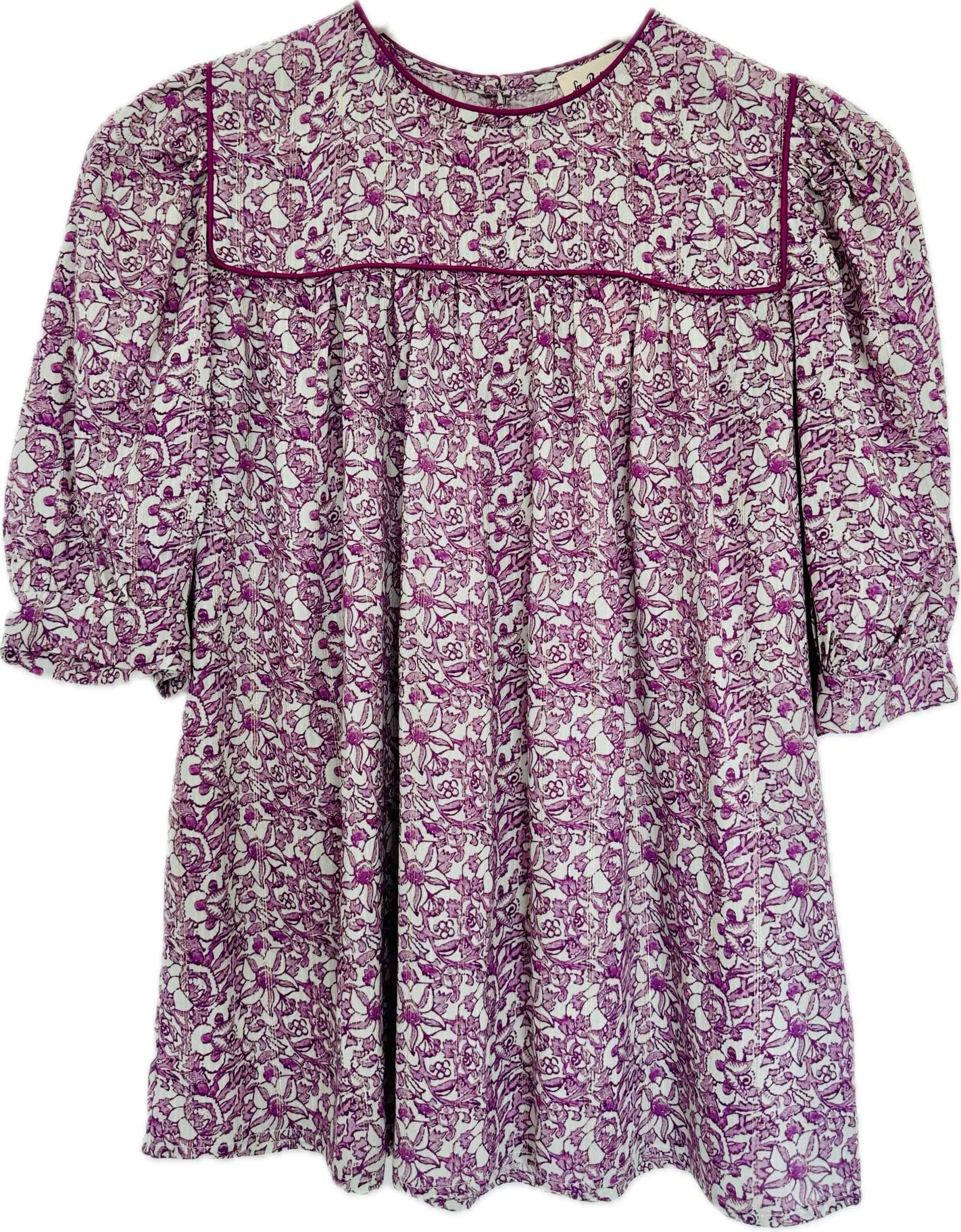 Ligera y fluida con manga corta ligeramente abullonada, confeccionada en viscosa estampada con hilo de lúrex. Cuello redondo con pechera ribeteada con un vivo al igual que el cuello. Apertura con botón en la espalda. Tela con certificado OEKO-TEX Standard 100.