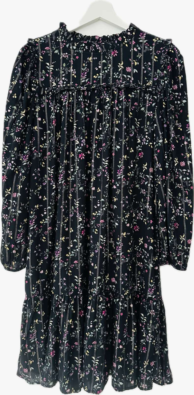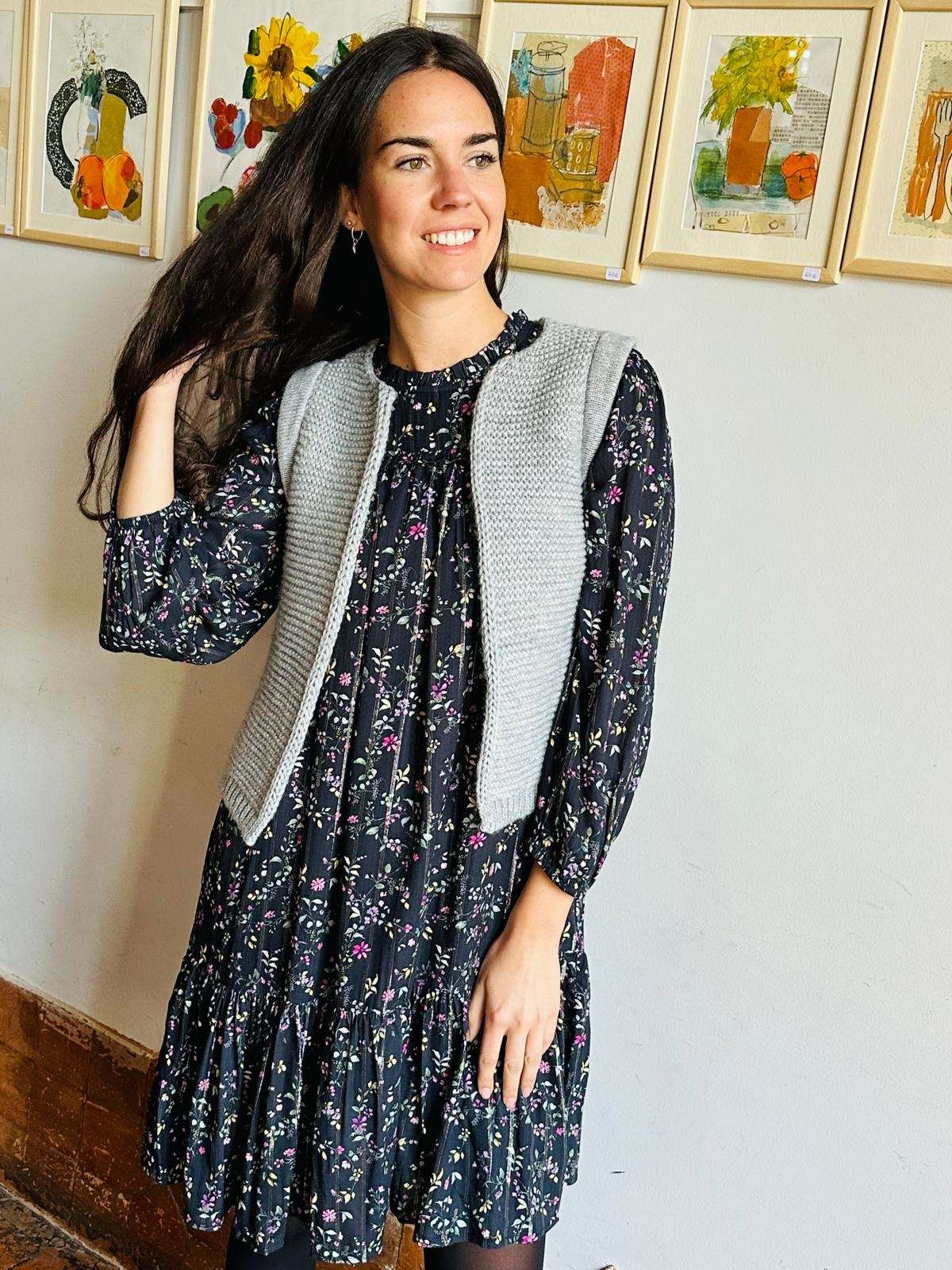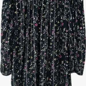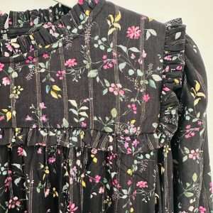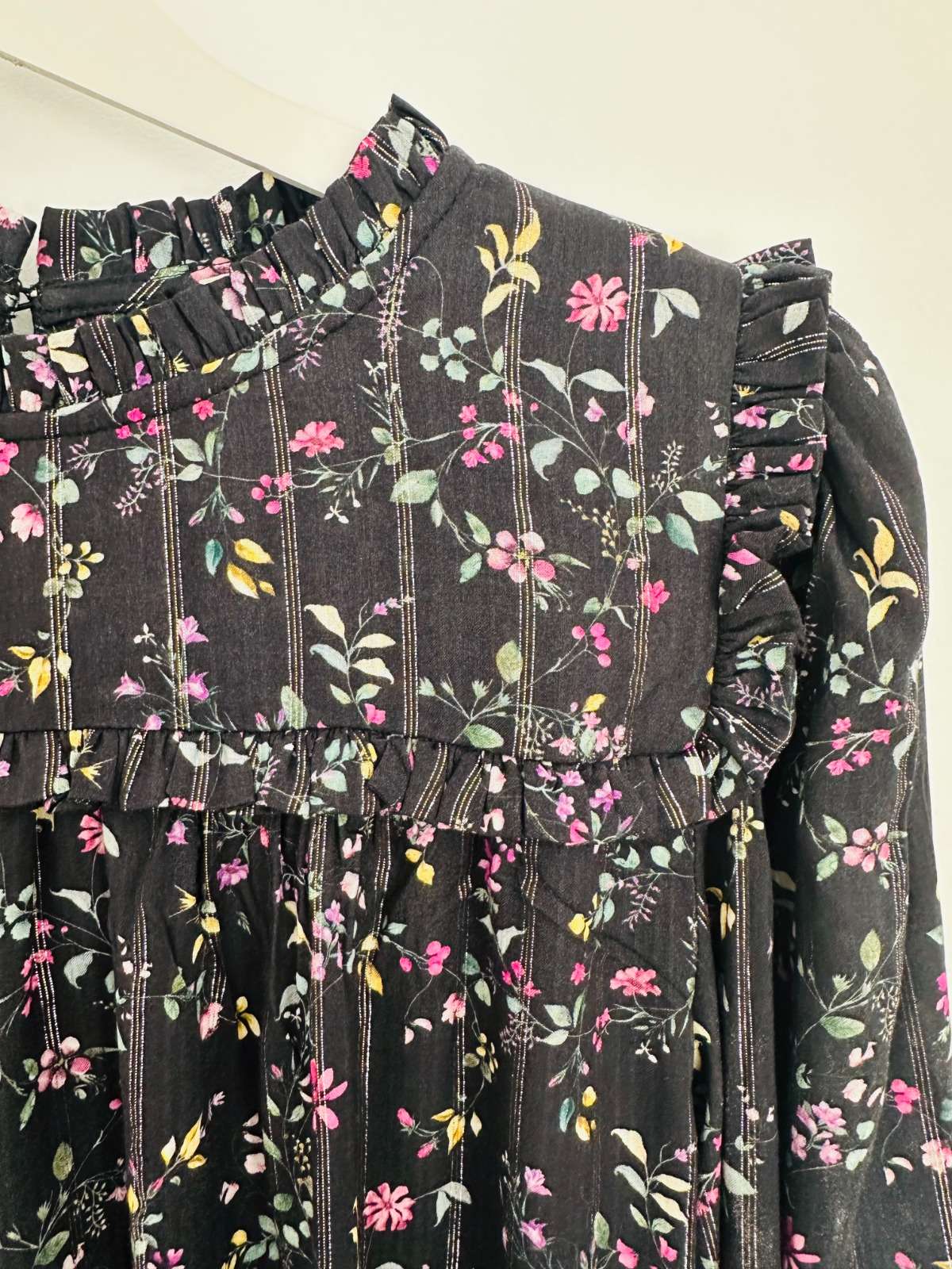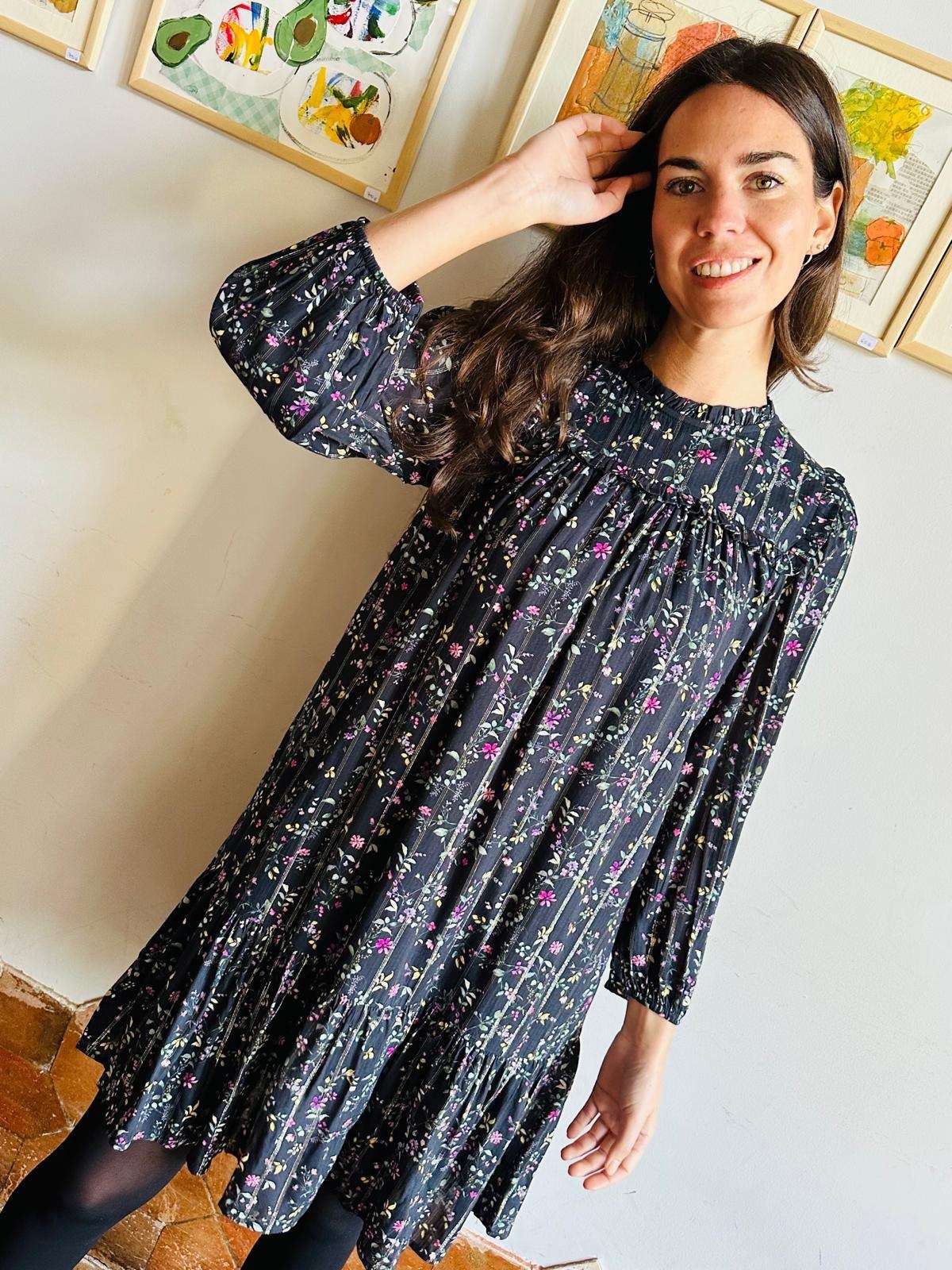 Vestido de corte evasé confeccionado en viscosa 100% estampada con hilo de lúrex. Pequeño volante en el cuello y a lo largo de toda la pechera y otro grande rematando la parte baja. Manga larga con puño elástica y apertura con botón en la espalda. Tela con certificado OEKO-TEX Standard 100.